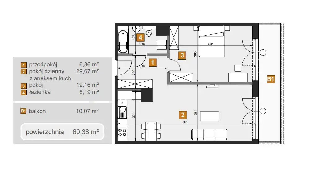 - Charakterystyka mieszkania 60.38 m2, 3 pokoje