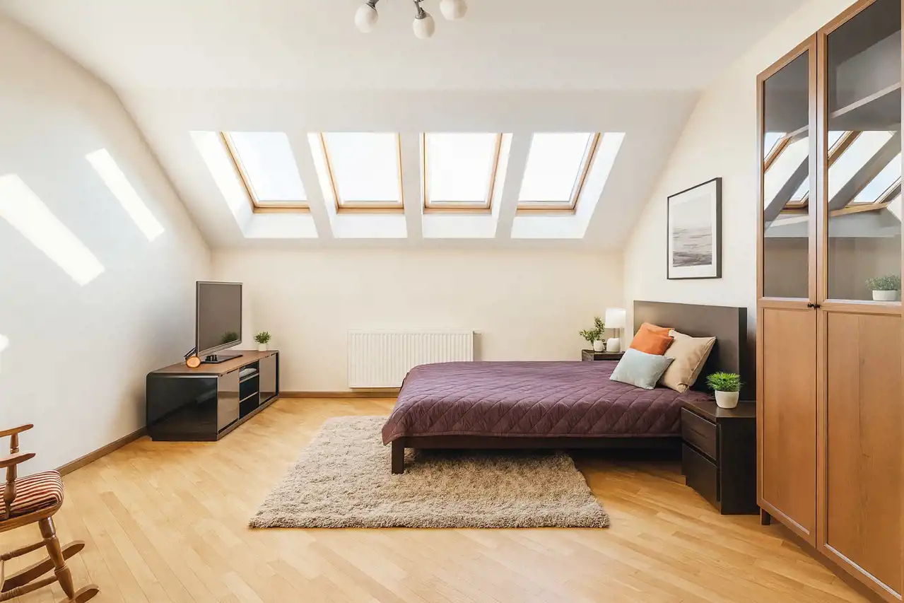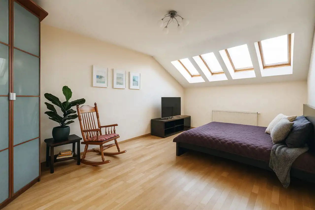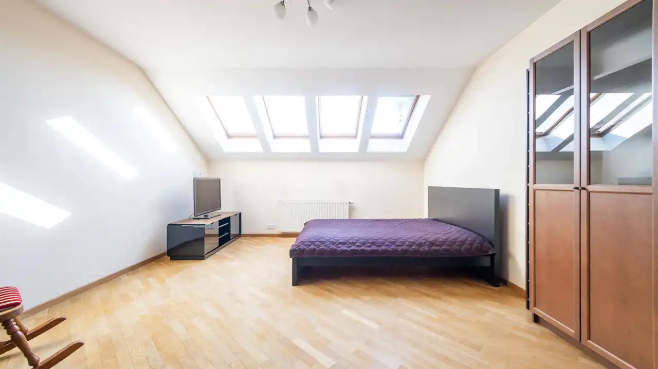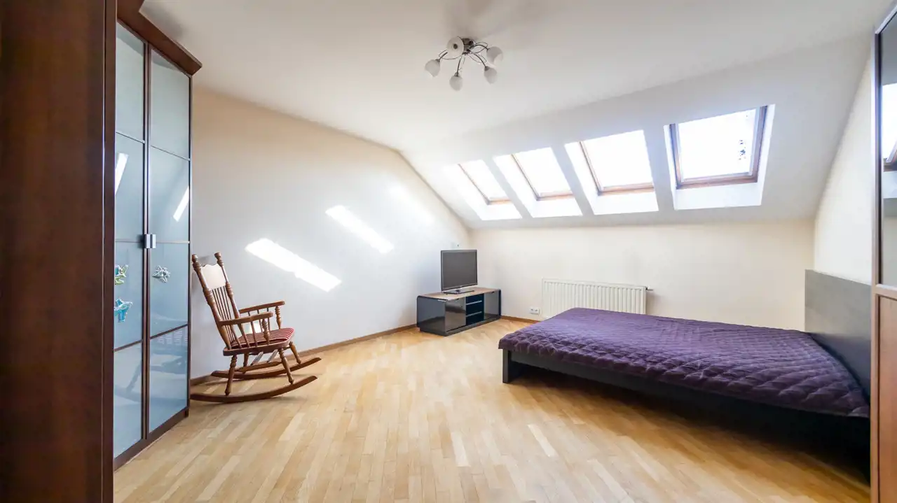 Ogrzewanie i ciepła woda z sieci miejskiej. Okna dachowe drewniane, pozostałe plastikowe.