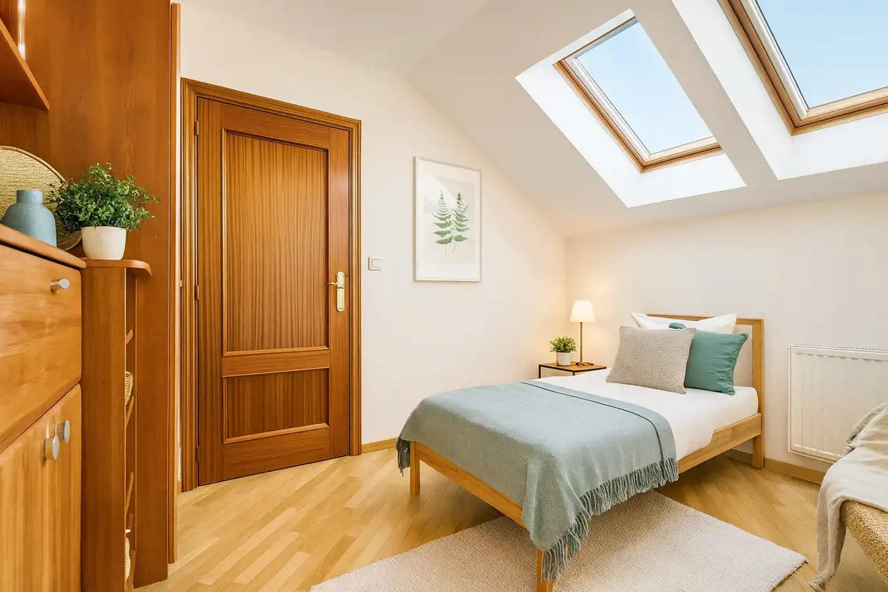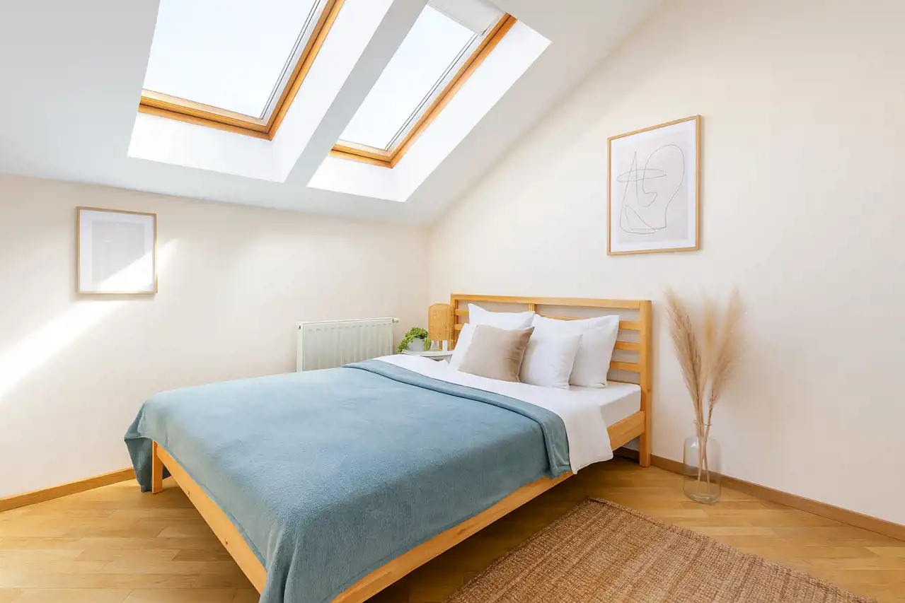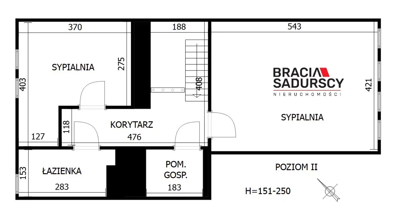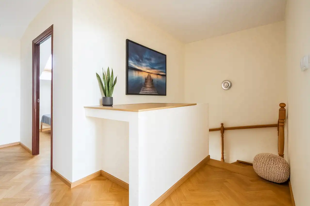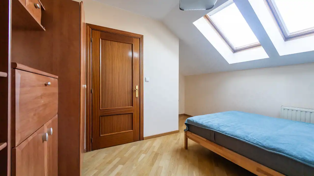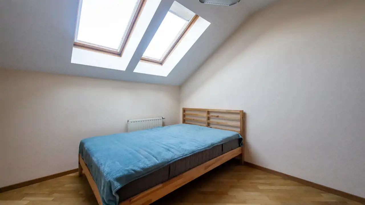 Drugi poziom to kolejne dwie sypialnie z oknami połaciowymi, łazienka z wanną oraz pomieszczenie gospodarcze.