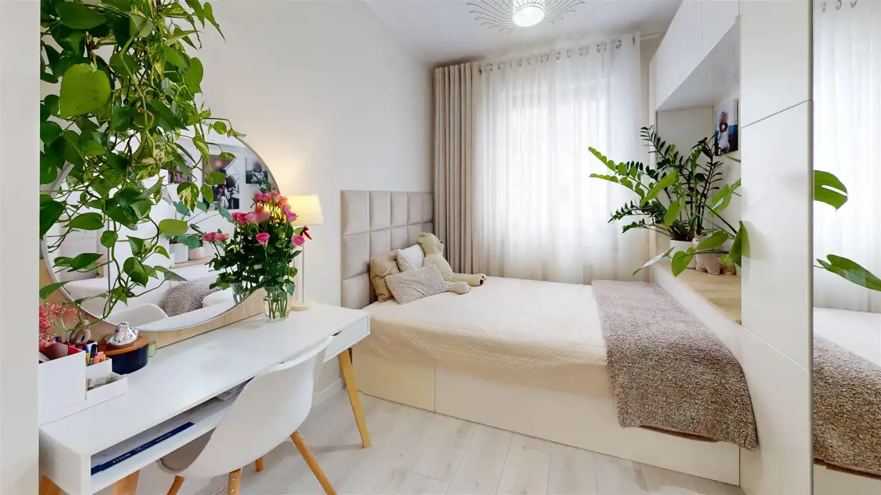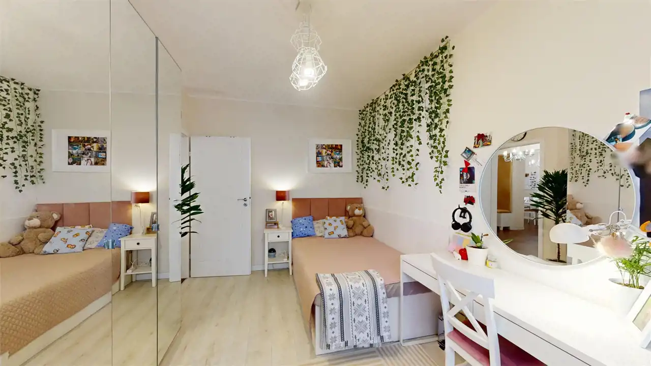 Dwie sypialnie podobnej wielkości z dużymi zabudowanymi na wymiar szafami.