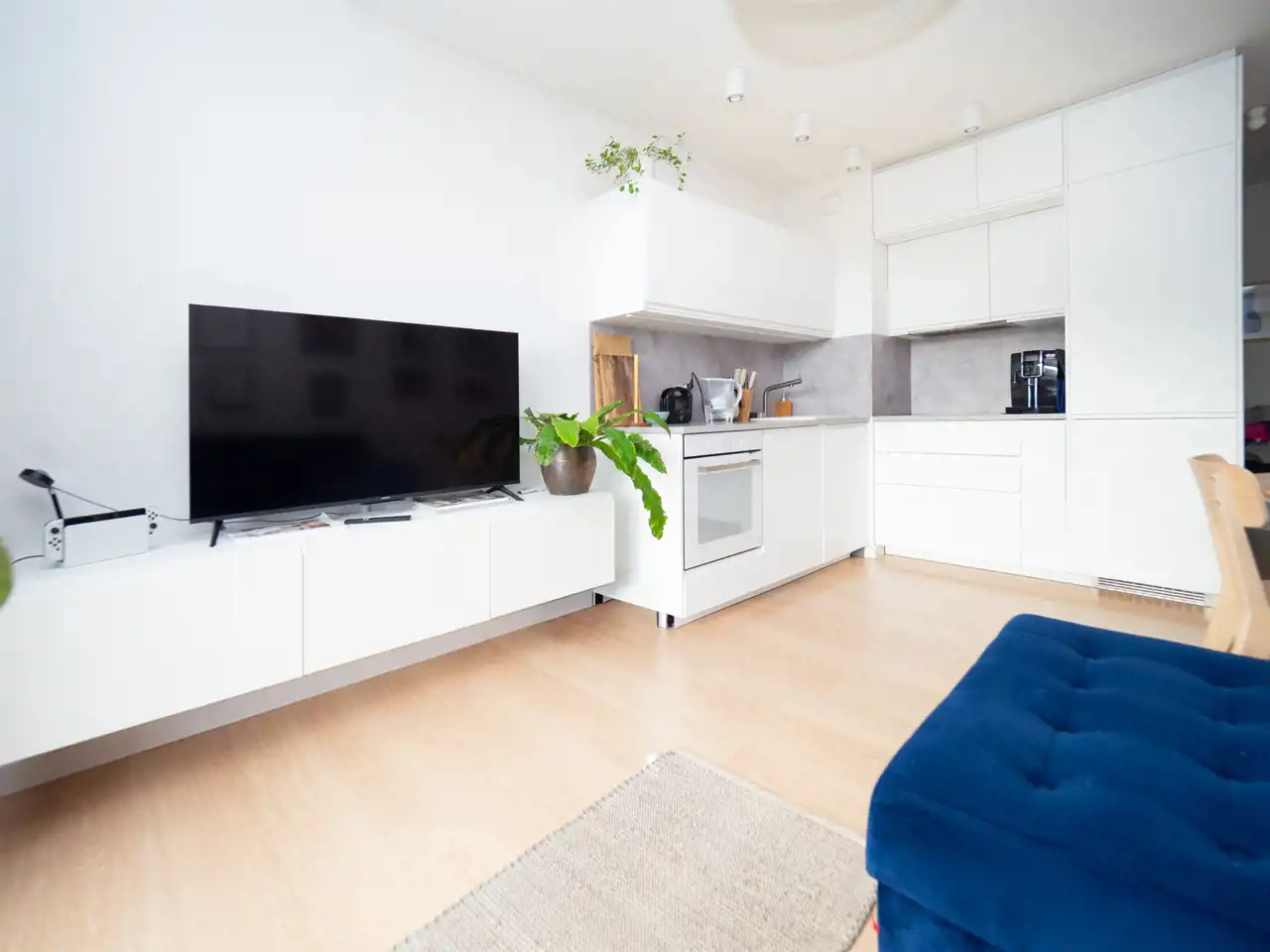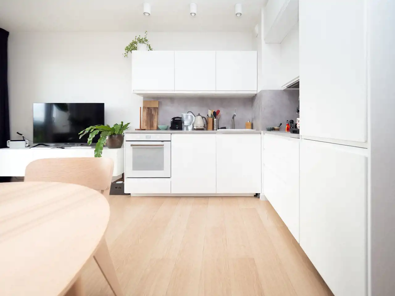 przestronny salon z aneksem kuchennym i wyjściem na balkon,