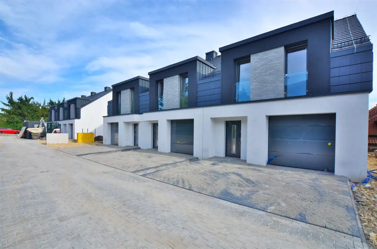 NOWOCZESNY DOM w zabudowie szeregowej przy ulicy Krzyżańskiego, kompleks 2 budynków w zabudowie szeregowej tworzących łącznie 6 lokali mieszkalnych jednorodzinnych. Wszystkie lokale mają tę samą powierzchnię, przynależne ogródki mają od 25m2 do 190m2, każdy posiada wbudowany garaż oraz jedno miejsce postojowe przed domem. Inwestycja została zaprojektowana zgodnie z najwyższymi standardami, przy użyciu nowoczesnych i trwałych materiałów budowlanych. Szczególna uwaga została poświęcona harmonijniej bryle budynków oraz kolorystyce, dzięki którym inwestycja jest spójna z okoliczną zabudową. Wysoka funkcjonalność rozwiązań architektonicznych oraz dobre nasłonecznie lokali tworzą przyjazny klimat dla przyszłych mieszkańców.