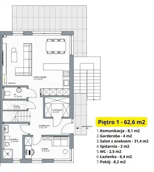 I piętro: komunikacja (8,1m2), garderoba (4m2), salon z aneksem (31,4m2), spiżarnia (2m2), WC (2,5m2), łazienka (6,4m2), pokój (8,2m2) - razem 62,6m2