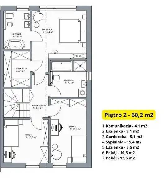 II piętro: komunikacja (4,1m2), łazienka (7,1m2), garderoba (5,1m2), sypialnia (15,4m2), łazienka (5,5m2), pokój (10,5m2), pokój (12,5m2) - razem 60,2m2