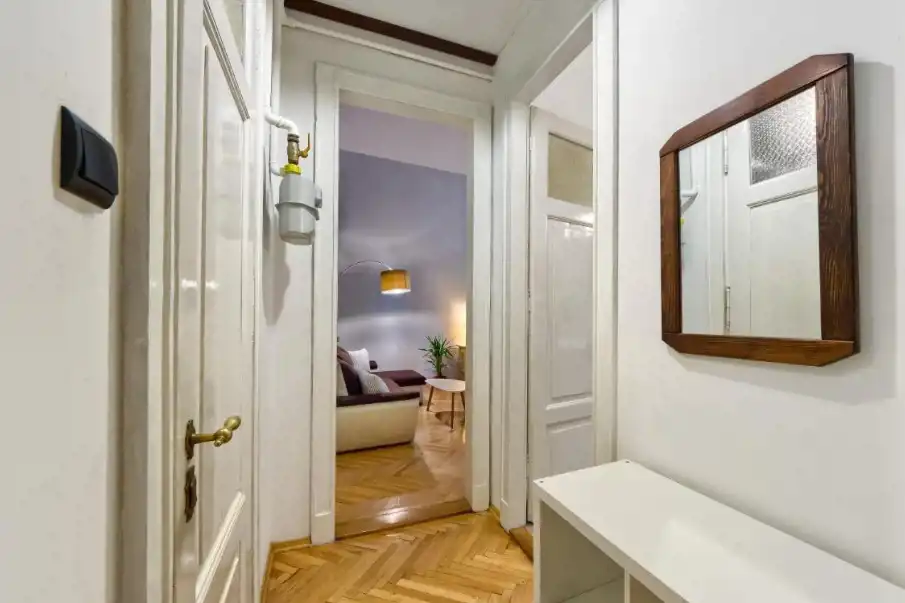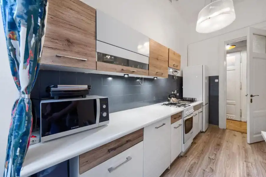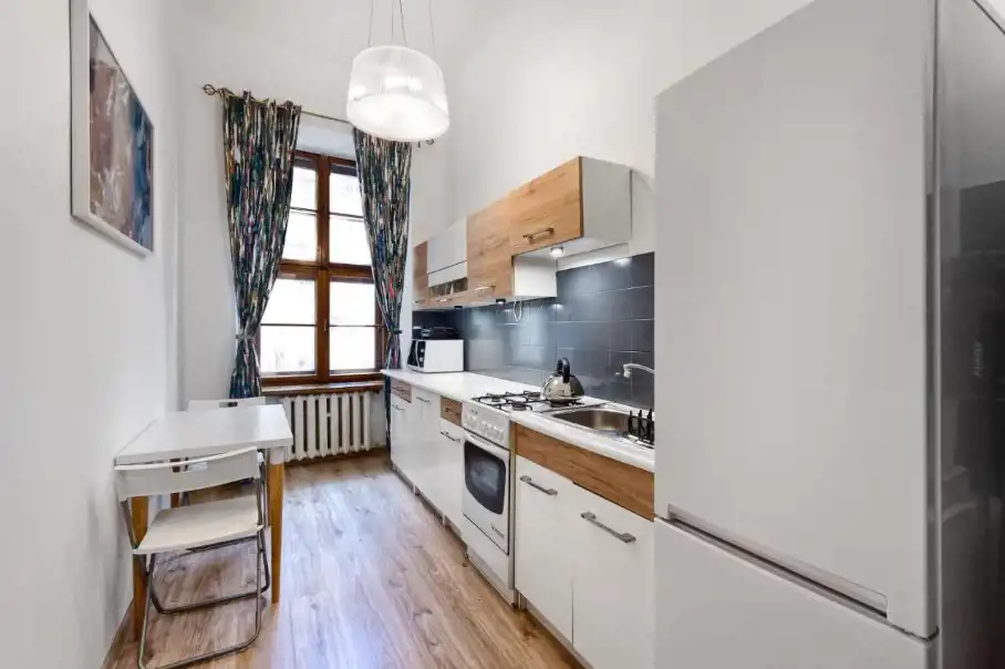 Jasna oddzielna kuchnia, w pełni wyposażona (talerze, sztućce, garnki) z lodówką, kuchenką gazową, piekarnikiem, mikrofalówką, stołem i krzesłami. Duży przedpokój z pojemną szafą.