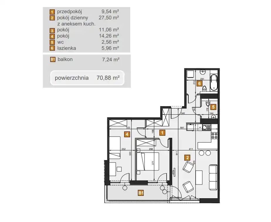 - Charakterystyka mieszkania 70.88 m2, 3 pokoje