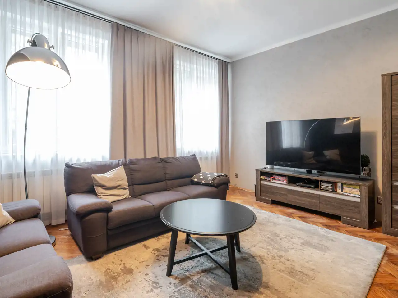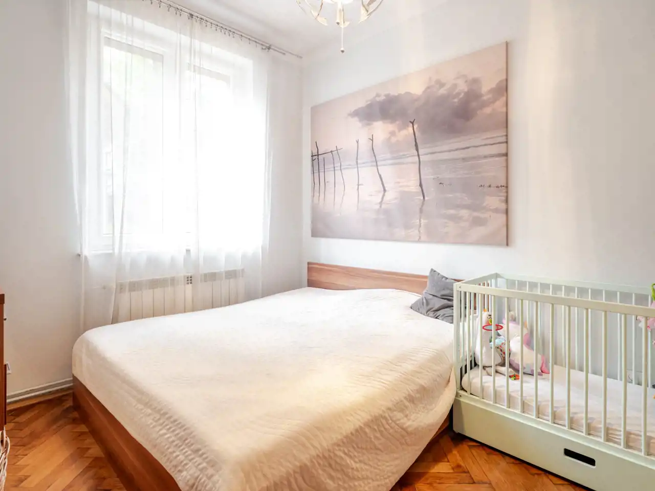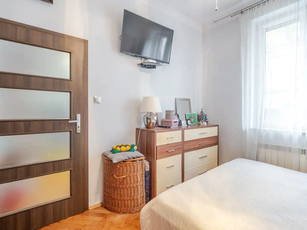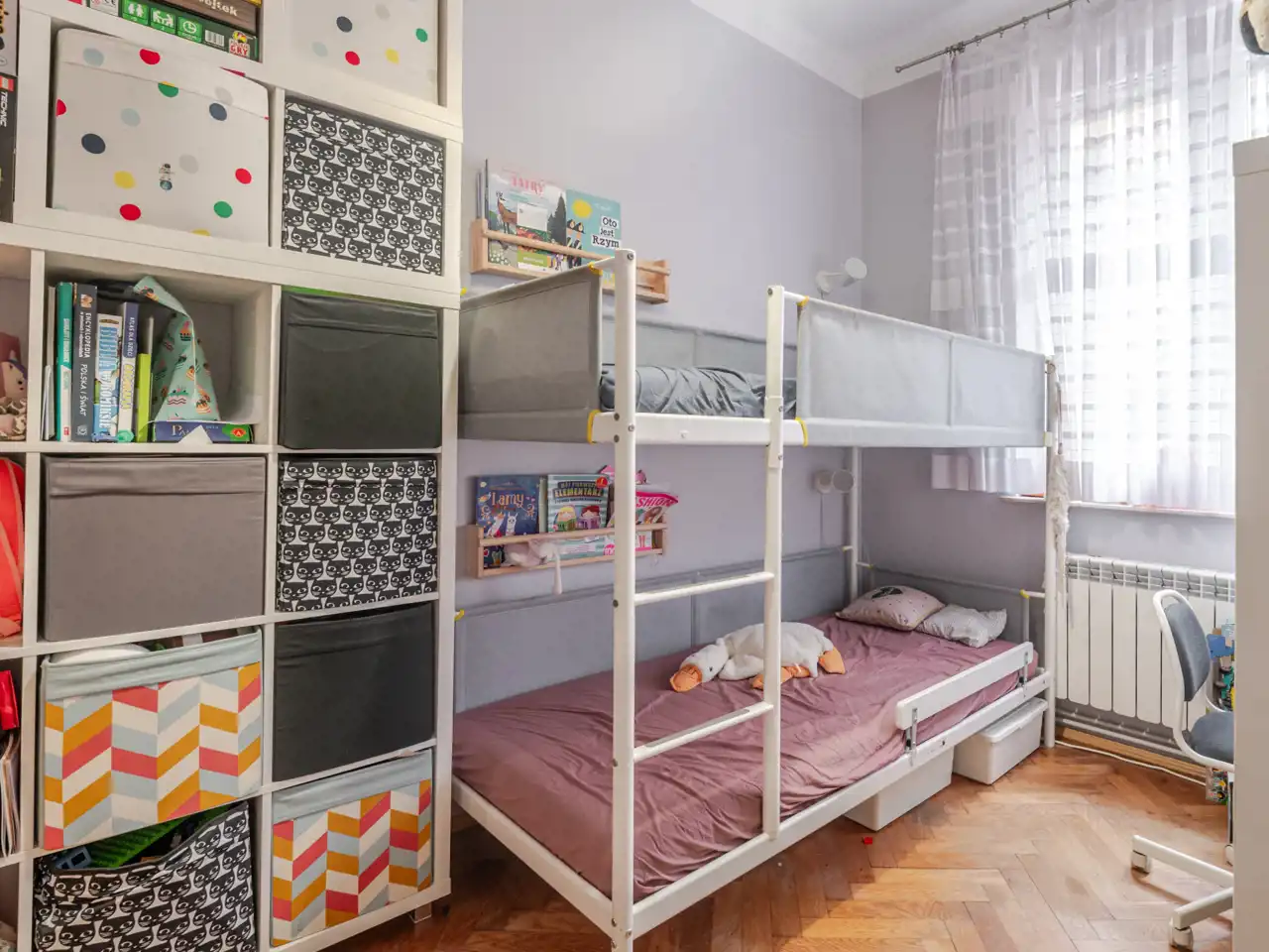 W pokojach klasyczny, dębowy parkiet w klimacie krakowskich kamienic.