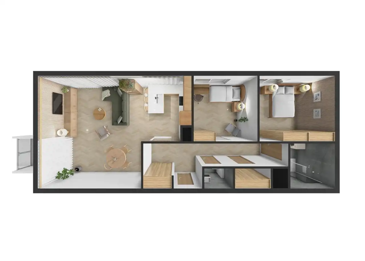 Układ mieszkania daje możliwość zmiany aranżacji i doprowadzenia go do pierwotnego stanu, w tym połączenia dwóch pokoi w jedną większą przestrzeń dzienną.