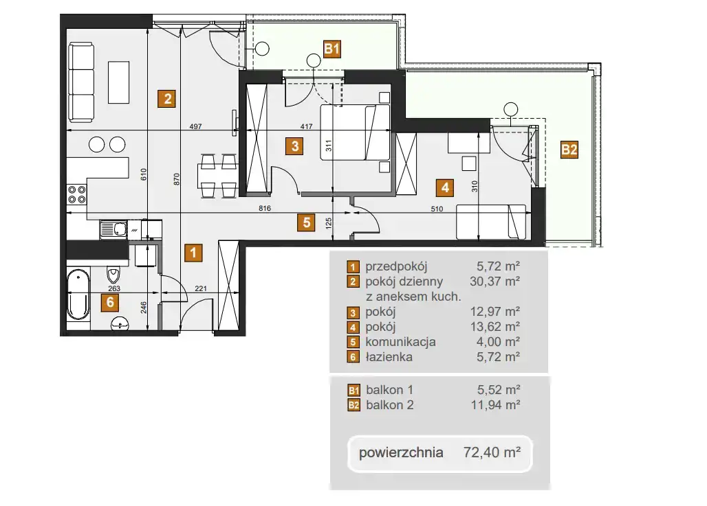 - Charakterystyka mieszkania 72.4 m2, 3 pokoje
