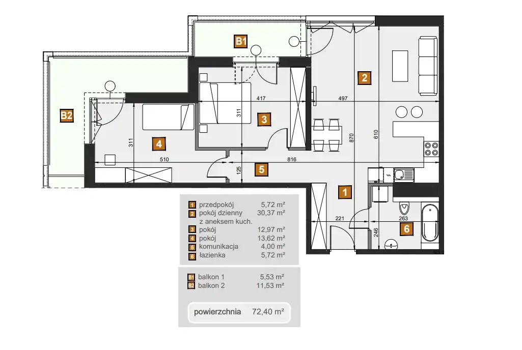 - Charakterystyka mieszkania 72.4 m2, 2 pokoje