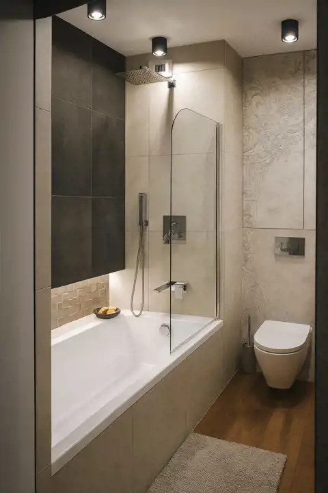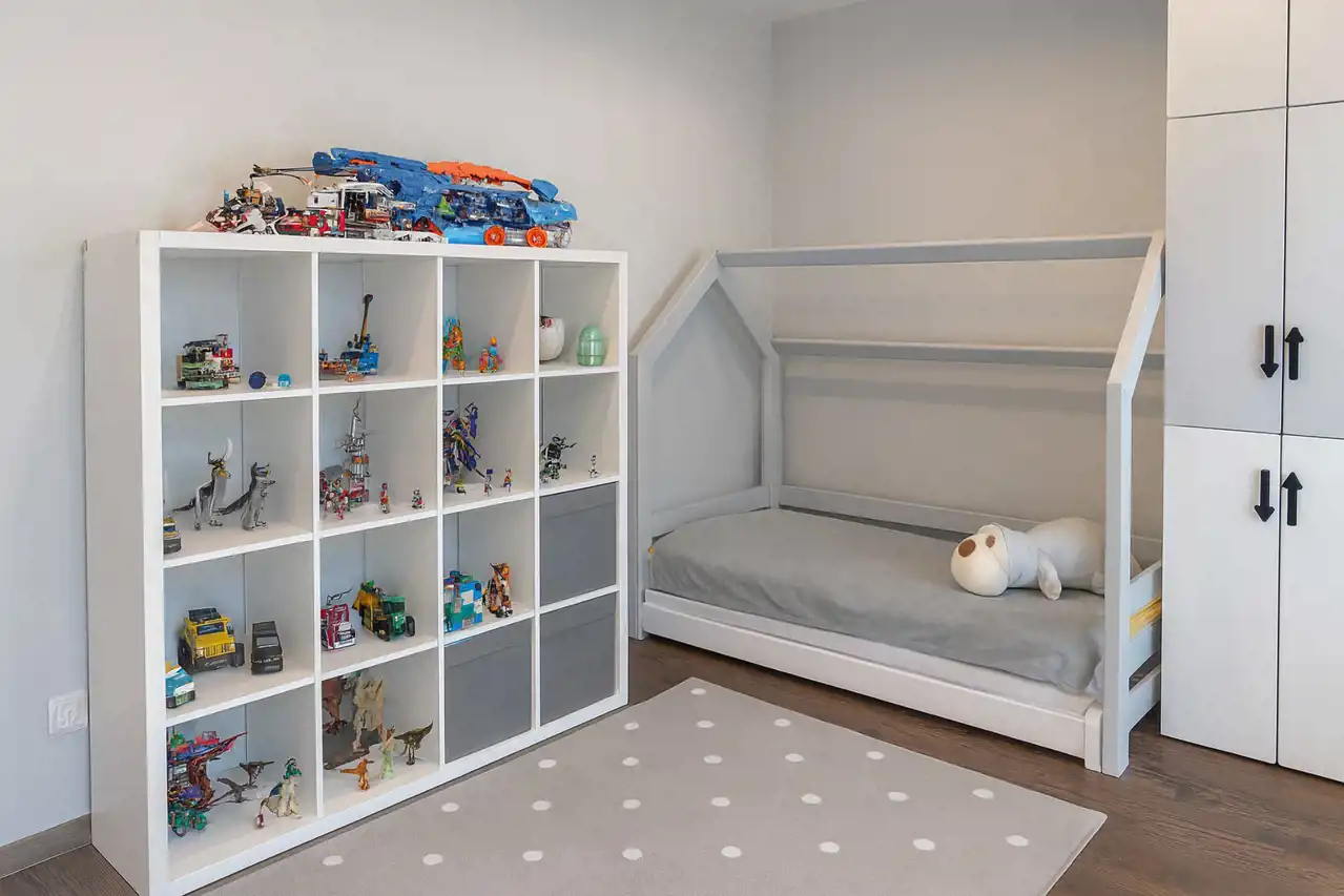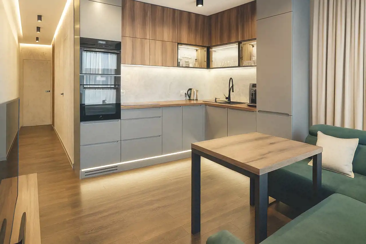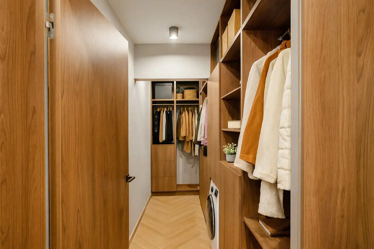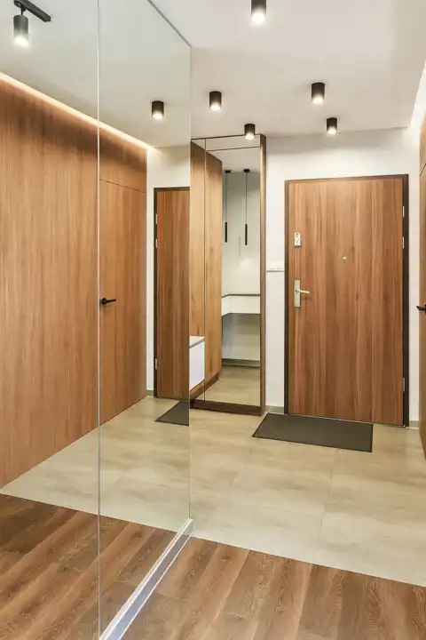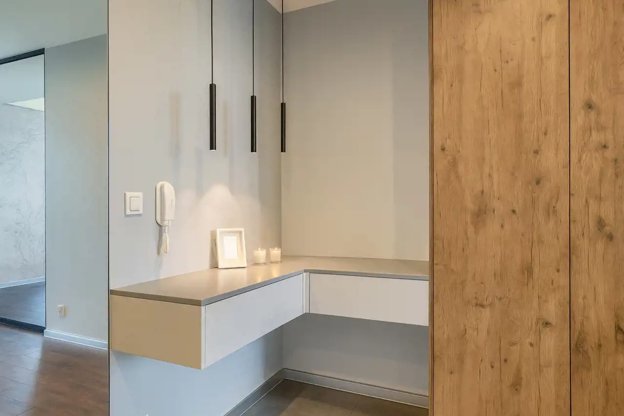 Mieszkanie położone jest na piątym piętrze. Ma widok na panoramę miasta dzięki sporemu oddaleniu od okolicznych budynków. Od razu po wejściu do mieszkania widać, że zostało zaprojektowane i wykończone z gustem, a przede wszystkim - praktycznością. Przy wejściu do mieszkania mamy okazałą garderobę oraz szafę zrobioną na zamówienie. Drzwi do pomieszczeń zostały ukryte za tapetą, która jest motywem powtarzającym się i tworzącym spójną całość wykończenia.