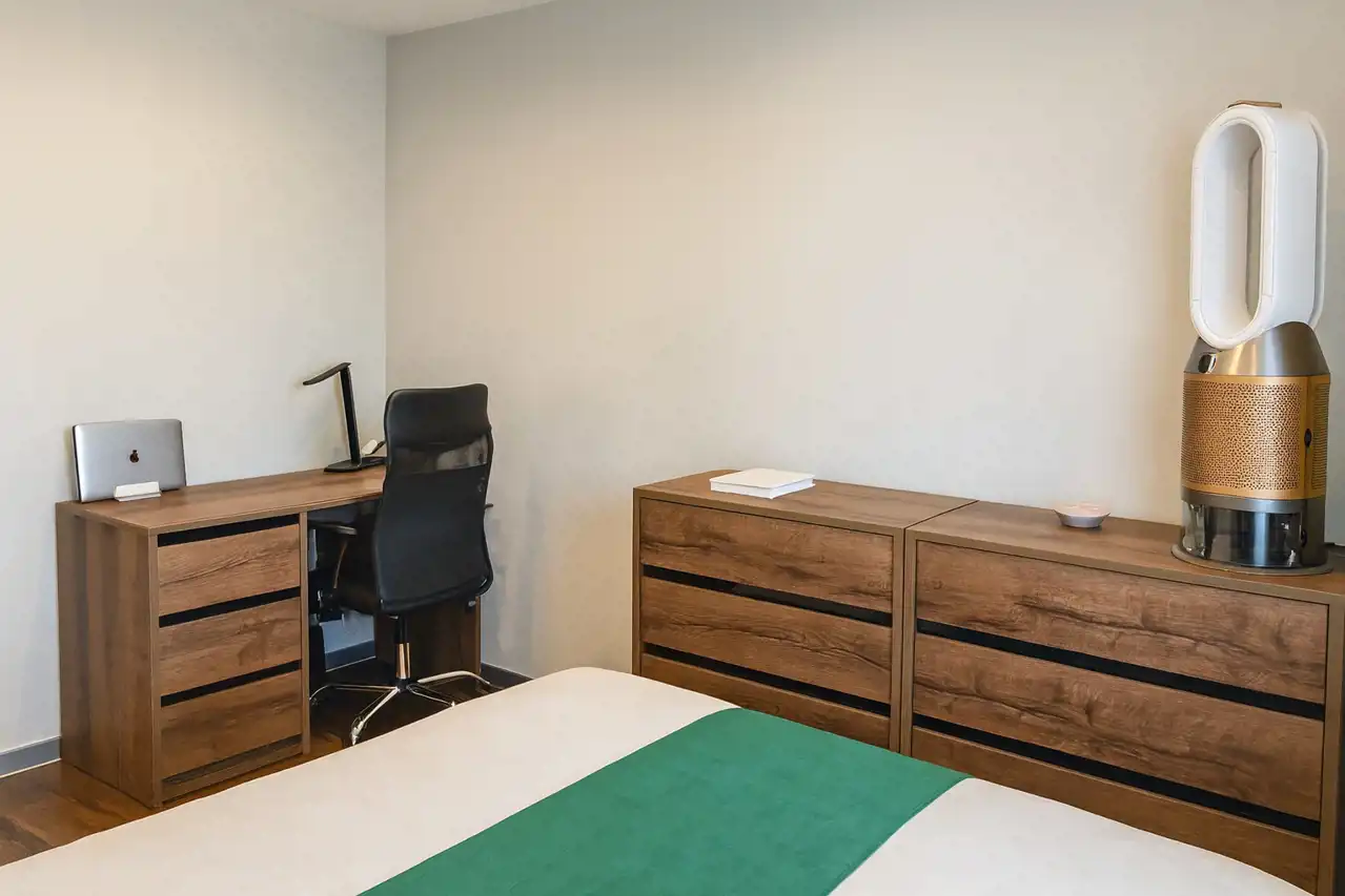 Mieszkanie ma 69,62 m2. Pierwotnie miało mieć trzy sypialnie, jednak obecni właściciele zdecydowali się na połączenie dwóch najmniejszych, by stworzyć większą przestrzeń. prócz sypialni do dyspozycji właścicieli jest salon z nowoczesną kuchnią o metrażu 19,9 m2, łazienka, toaleta, garderoba, przedpokój. Wszystko wykończone jest w wyższym standardzie.