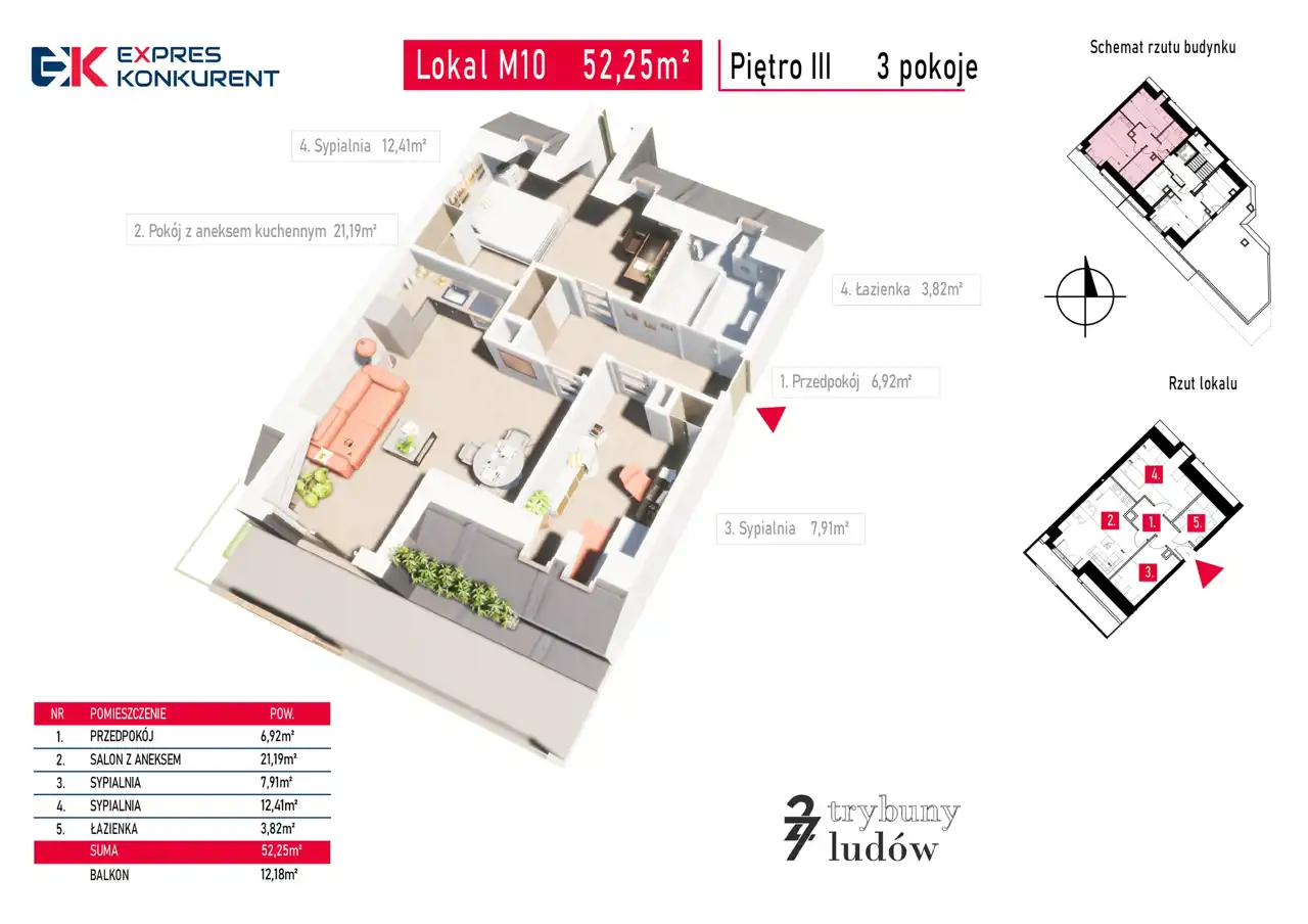 - Charakterystyka mieszkania 52.74 m2, 3 pokoje