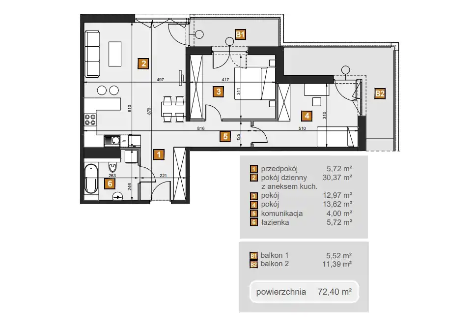 - Charakterystyka mieszkania 72.4 m2, 3 pokoje