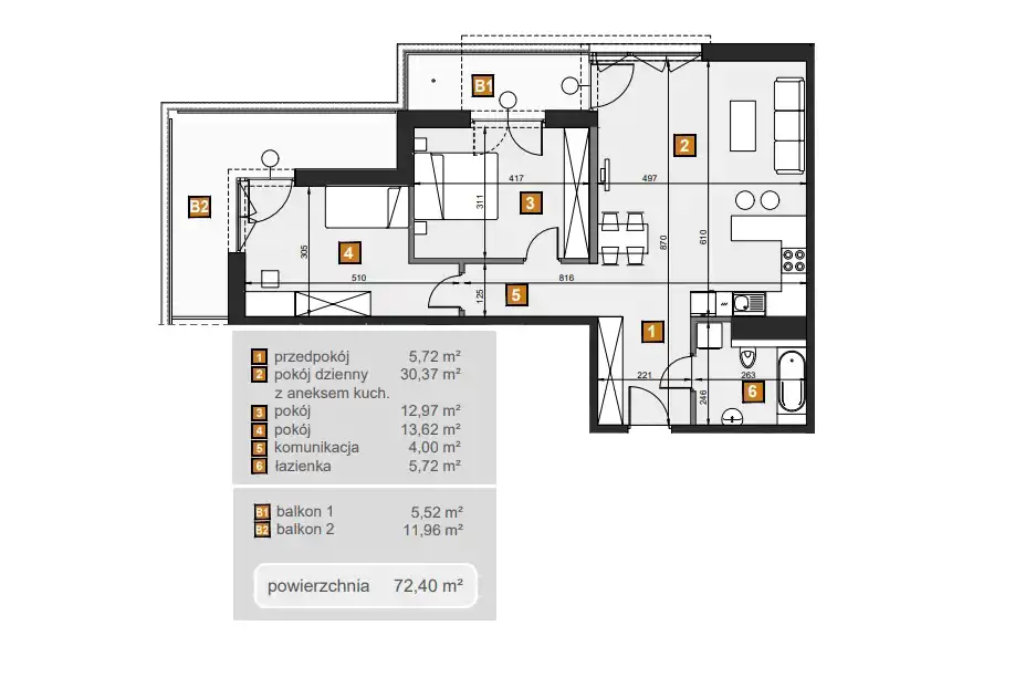 - Charakterystyka mieszkania 72.4 m2, 3 pokoje