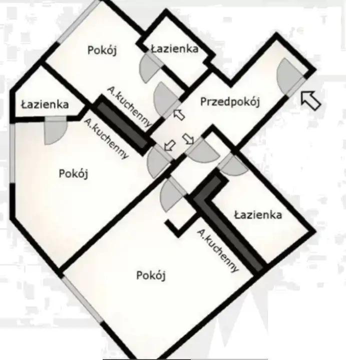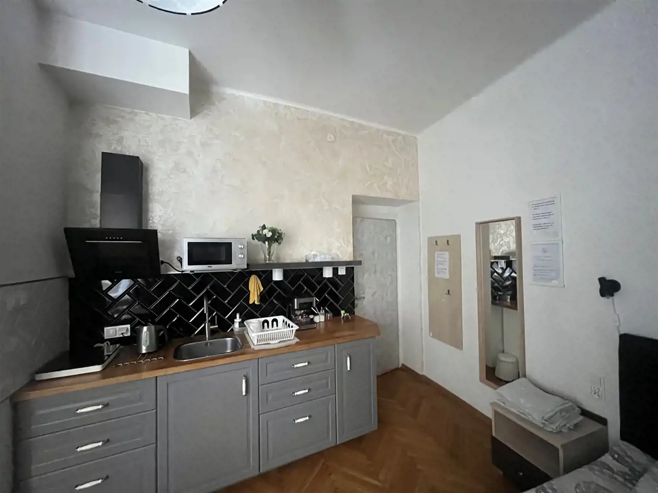 Lokal podzielony jest na 3 kawalerki, każda z aneksem kuchennym i łazienką.
