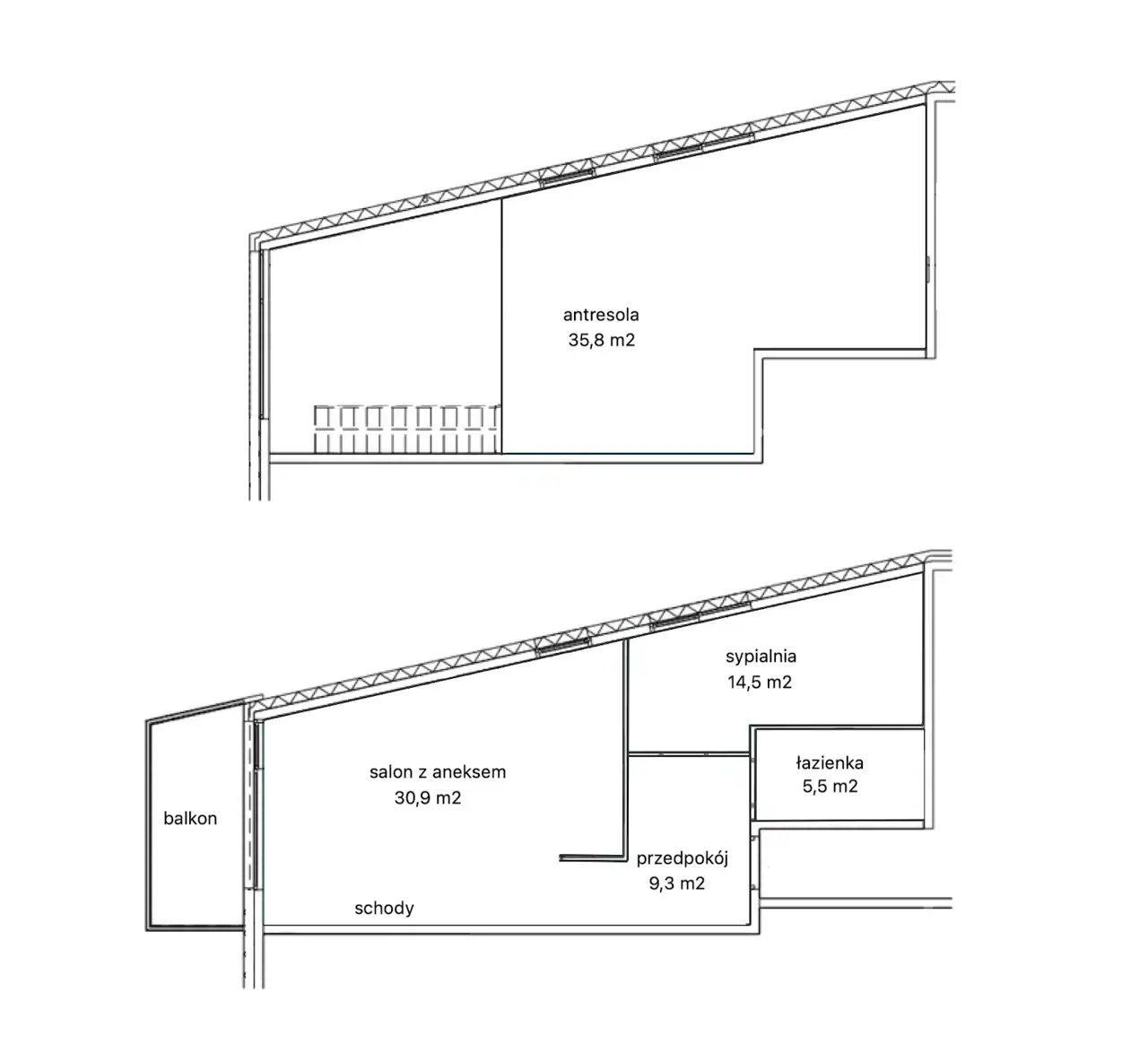 4. Antresoli - 35,8 m2 (z możliwością wydzielania 2 osobnych sypialni oraz łazienki)