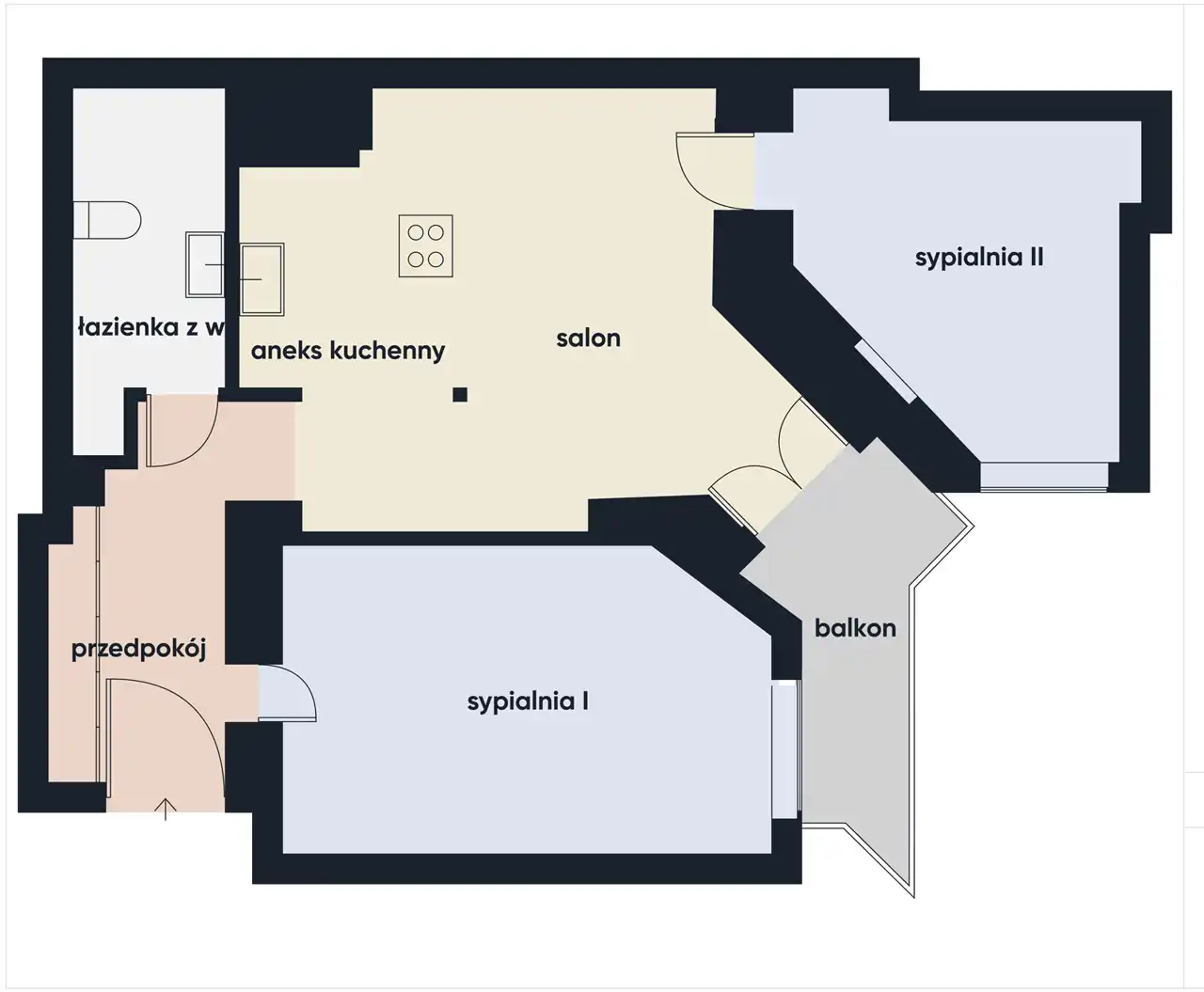 Mieszkanie składa się z: przedpokoju, przejściowego salonu z aneksem kuchennym, 2 sypialni oraz łazienki w wc. Z salonu wyjście na balkon.