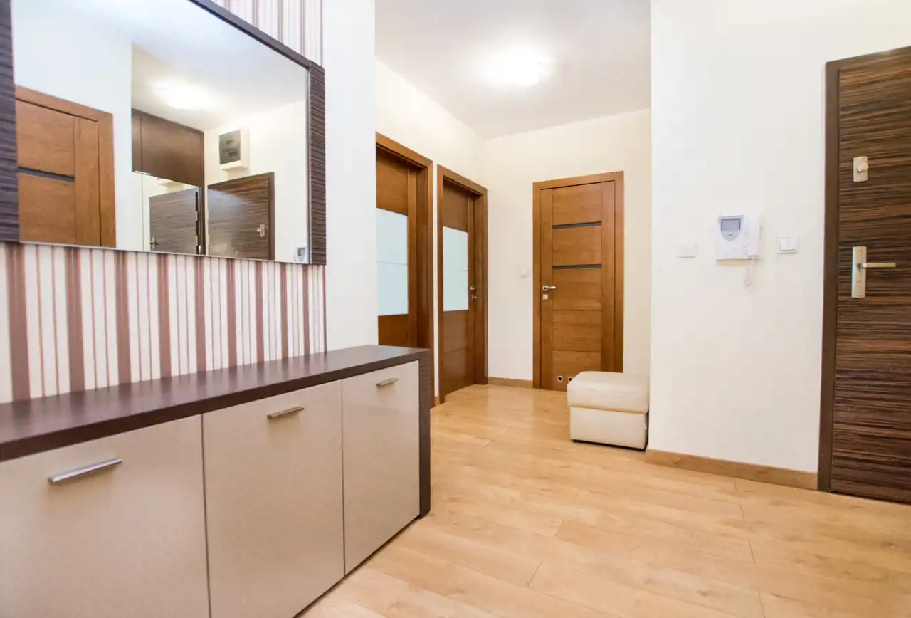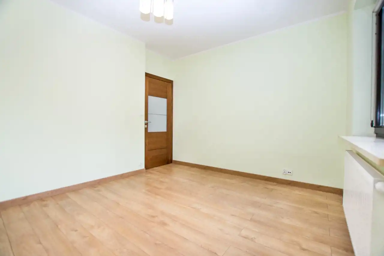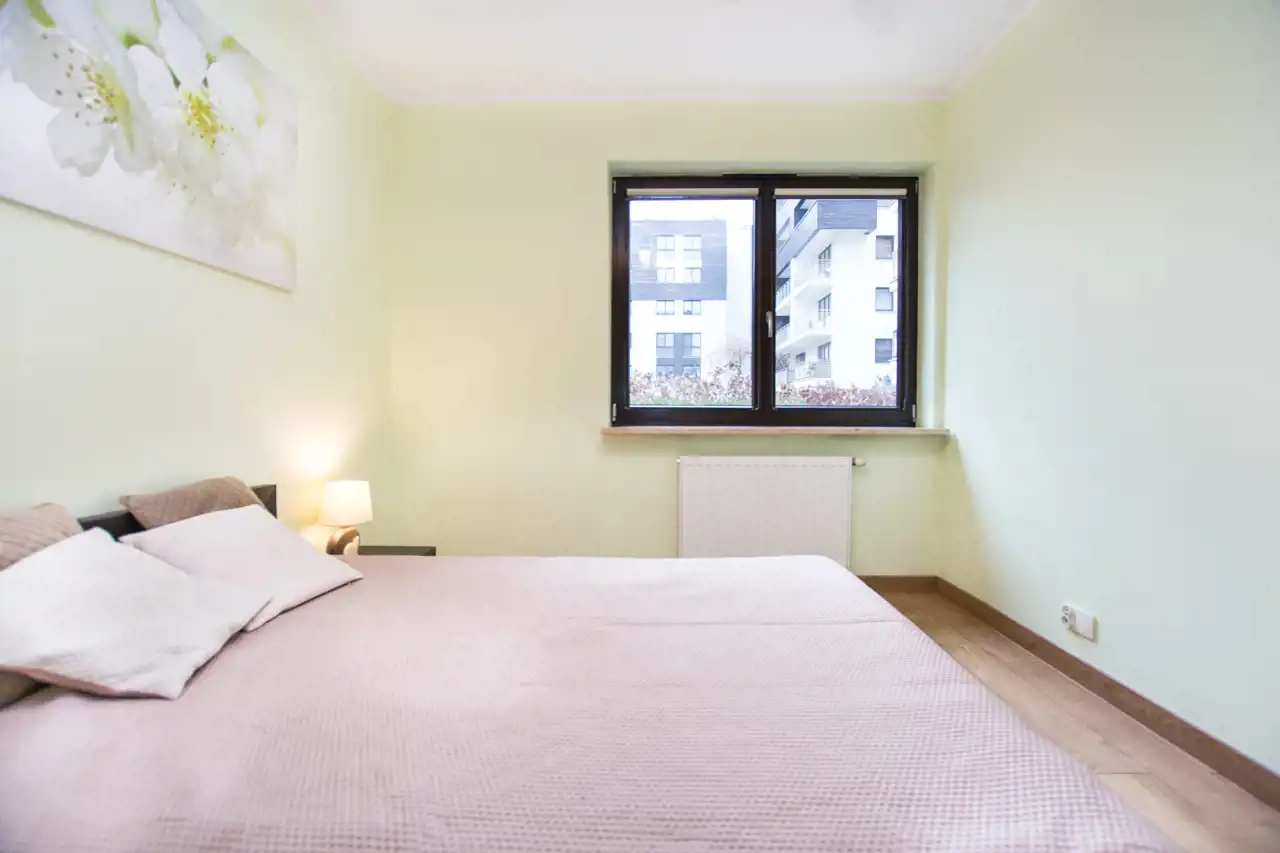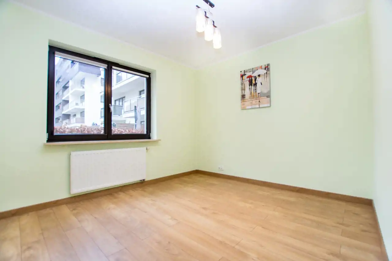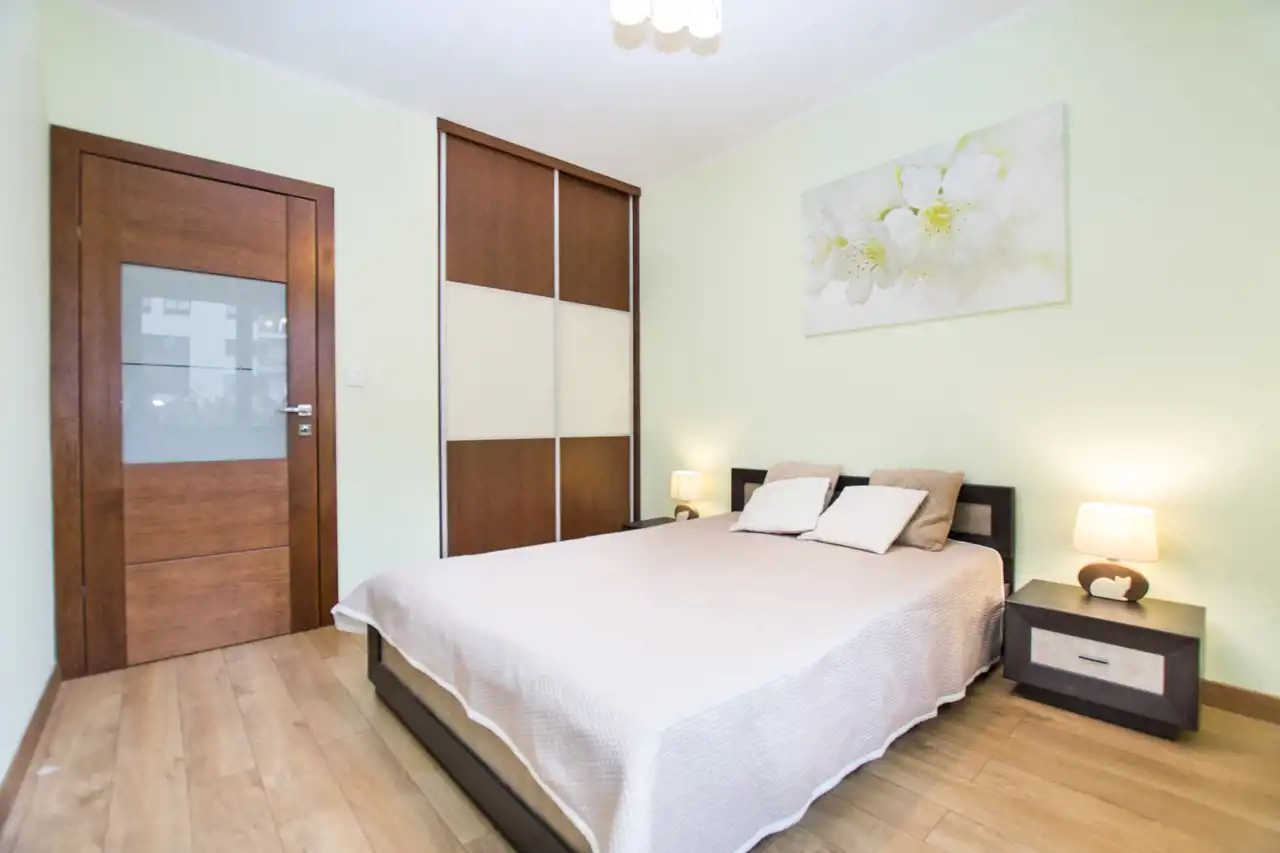 Salon wyposażony dużą sofę, Telewizor, zabudowę szaf, stół z krzesłami oraz wyjście na balkon. Kuchnia wyposażona w zabudowę kuchenną z dużą ilością miejsca do przechowywania, sprzęty takie jak lodówko-zamrażarka, piekarnik, zmywarka, płyta indukcyjna, okap. Całe pomieszczenie jasne i przestronne. Sypialnia wyposażona w duże 2-osobowe łóżko szafki nocne oraz szafę. Łazienka z kabiną prysznicową wyposażona w umywalkę z szafką, duże lustro oraz WC. Pokój jest nieumeblowany - do własnej aranżacji. W przedpokoju komoda. Dużym atutem mieszkania jest garderoba.