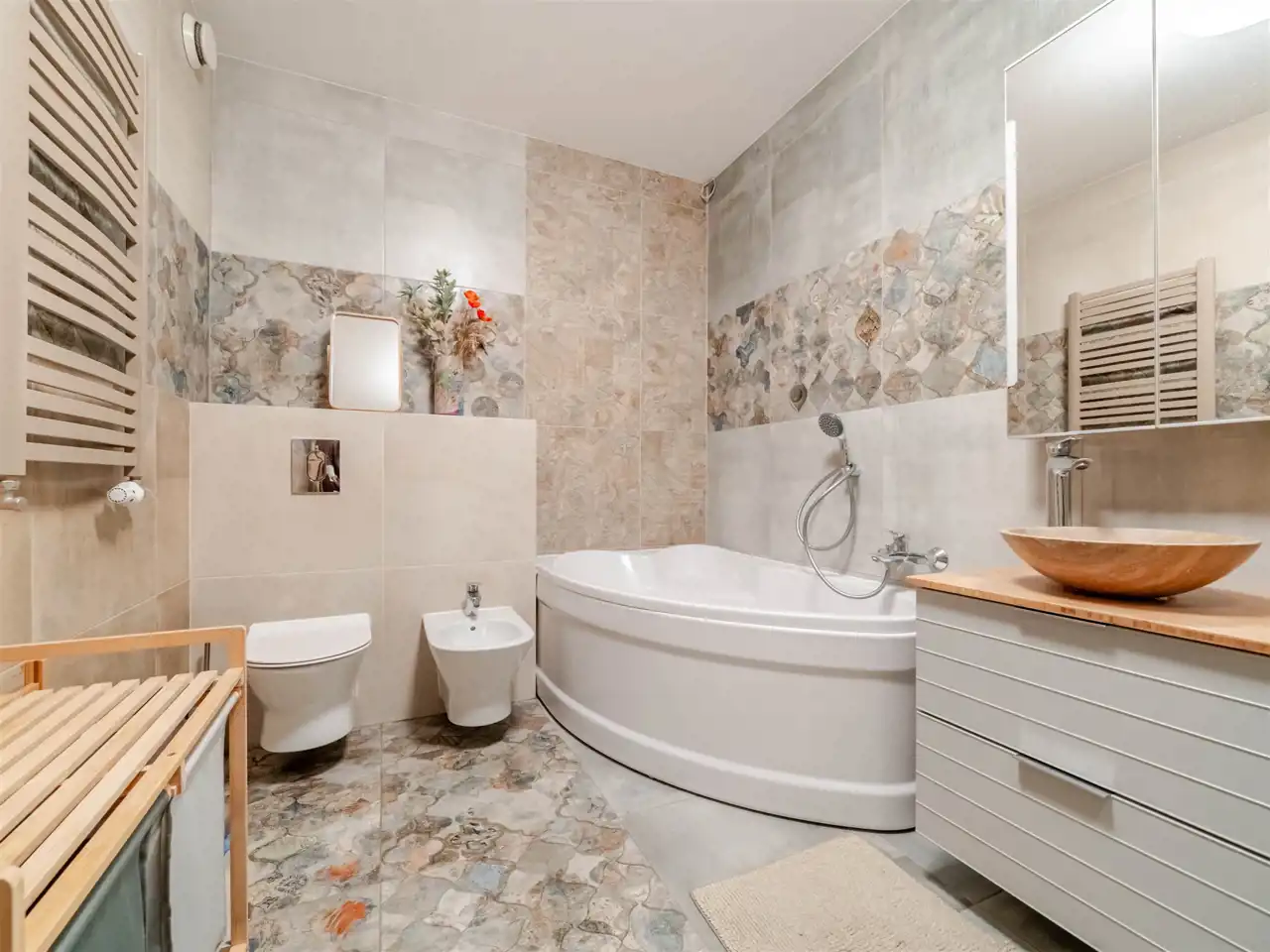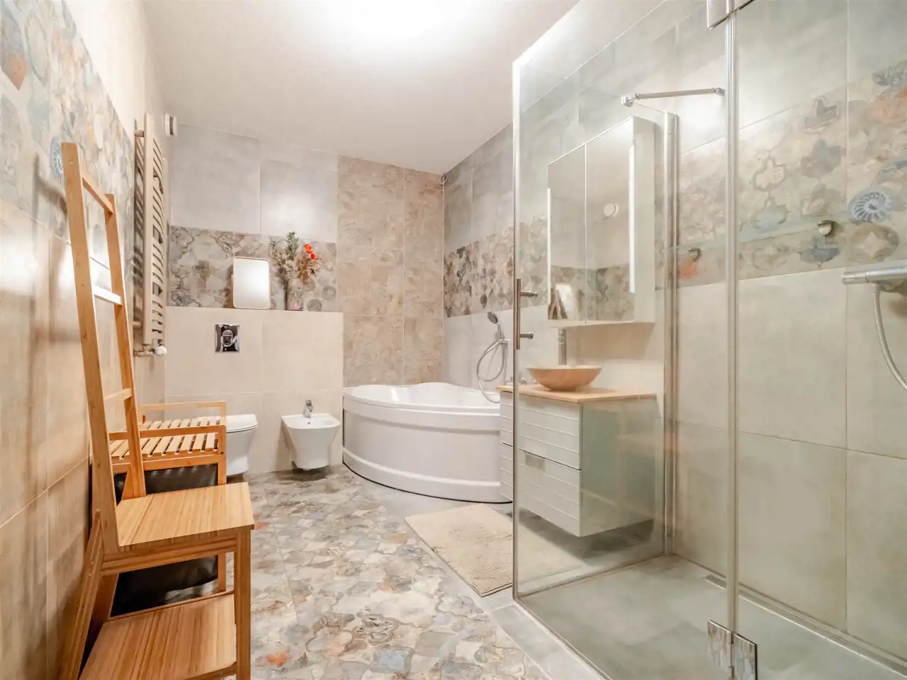 - Łazienka 1 o pow. ~8 m2 wyposażona w wannę, kabinę prysznicową, toaletę oraz bidet.