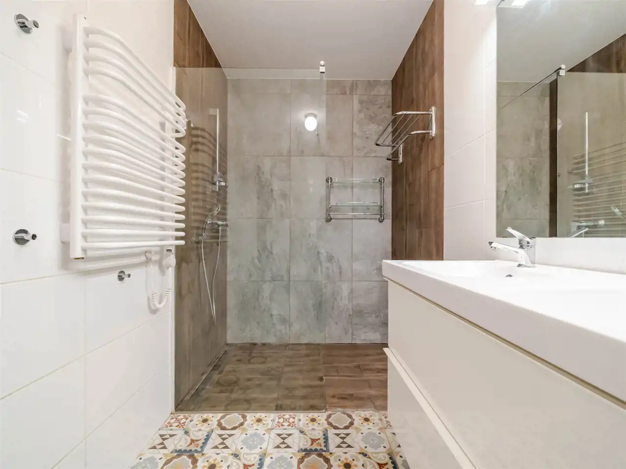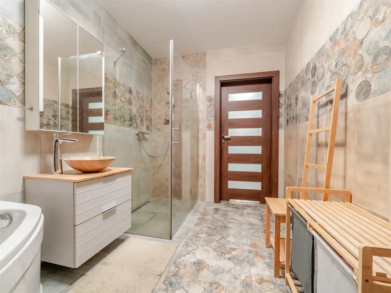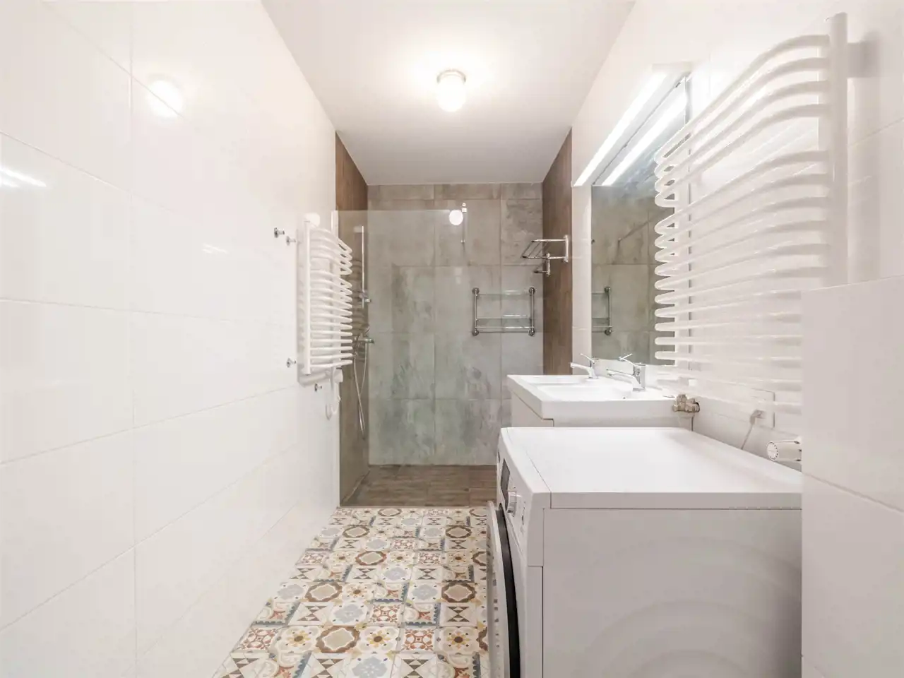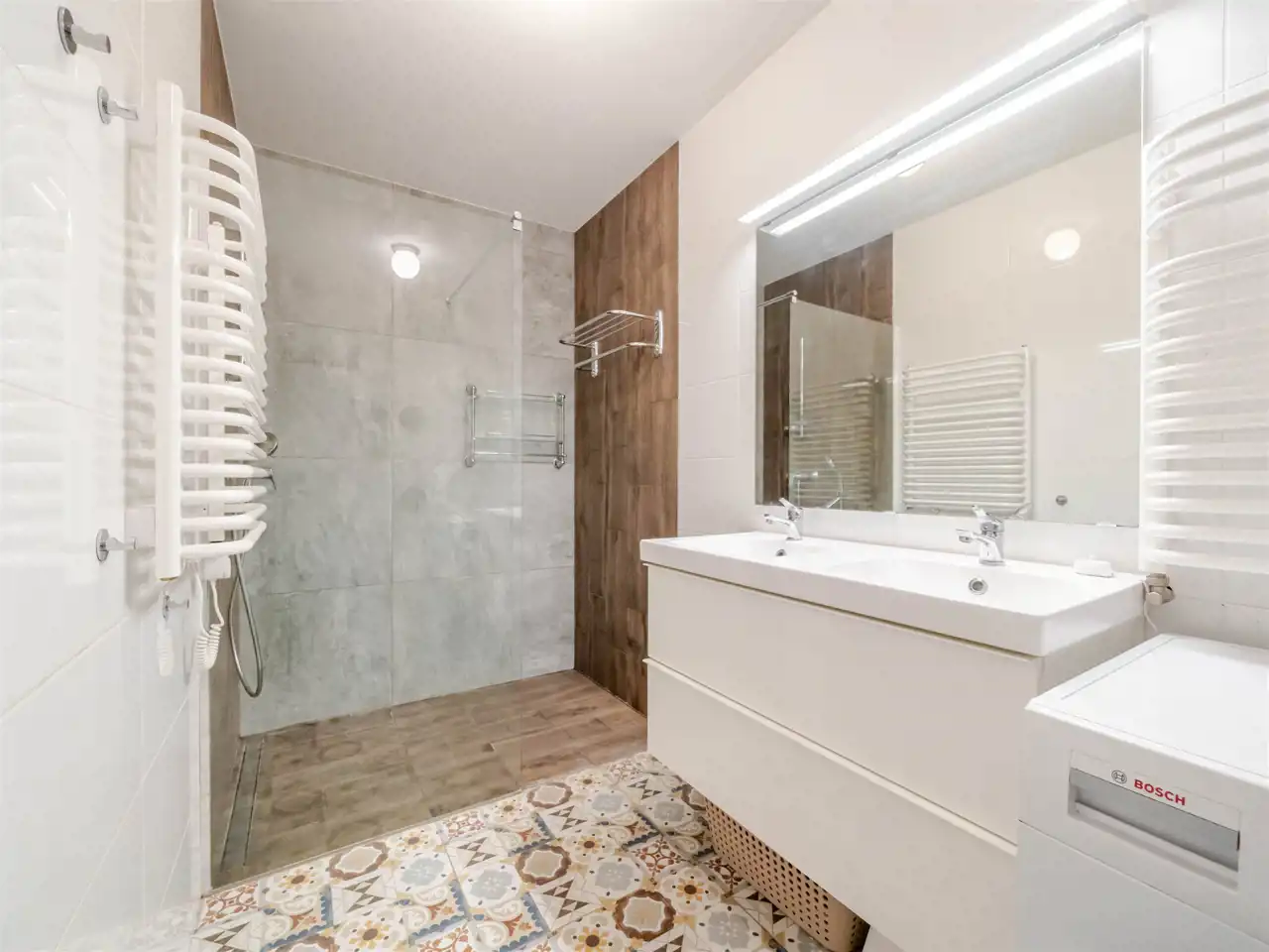 - Łazienka 2 o pow. ~7,5 m2 z kabiną prysznicową (walk-in), toaletą, podwójną umywalką oraz pralką