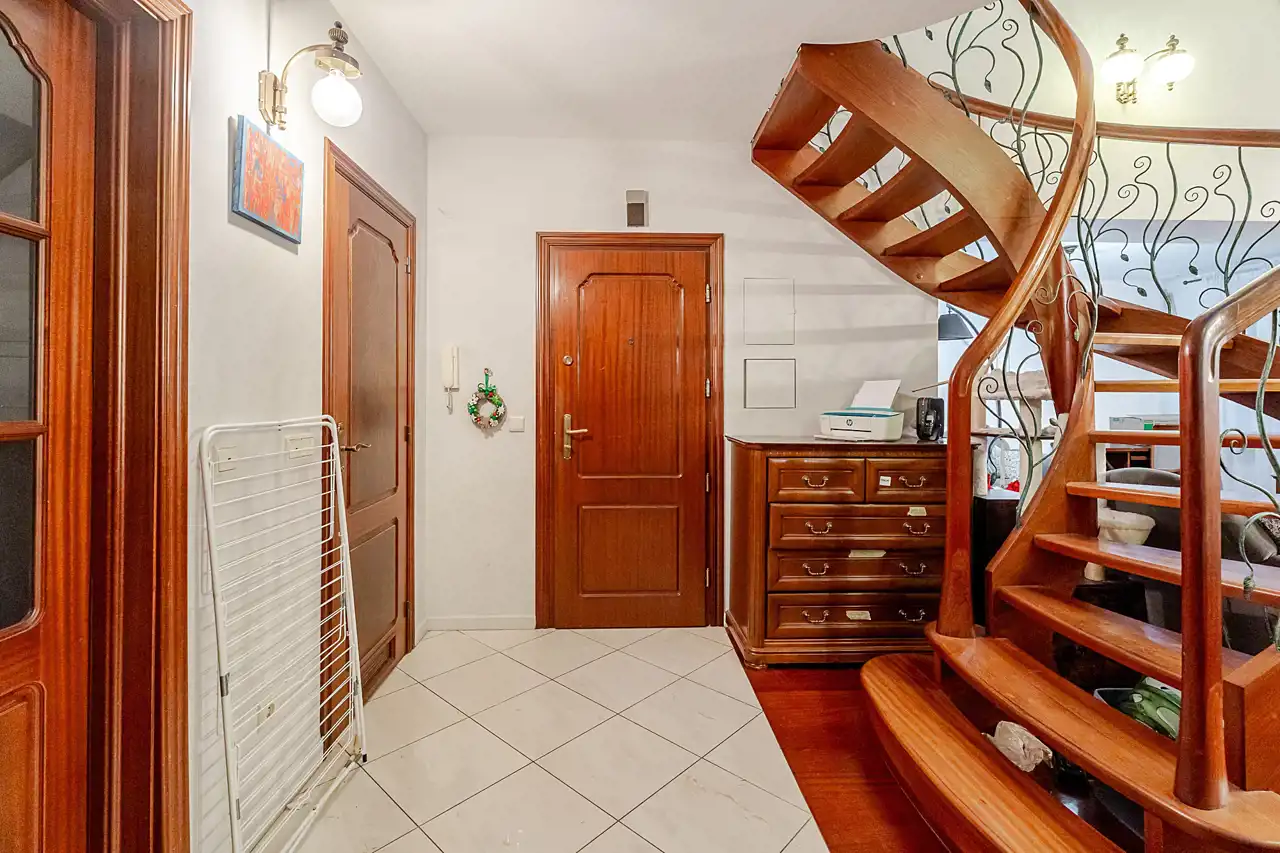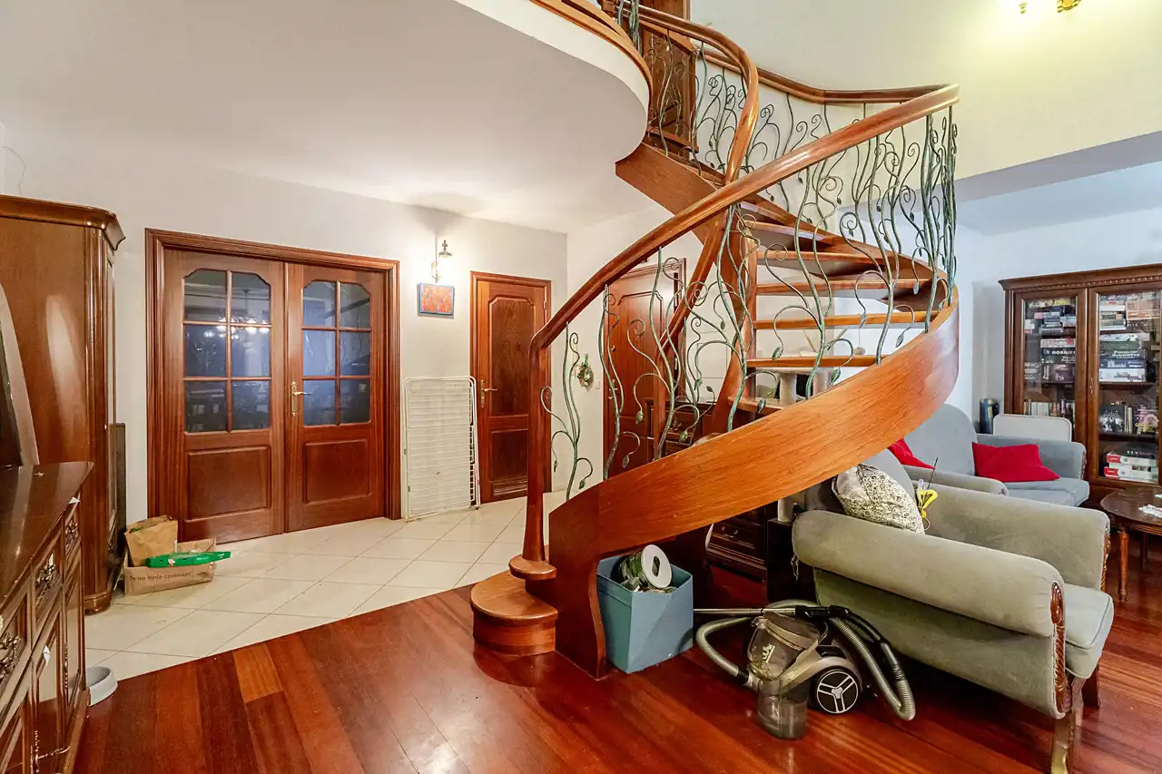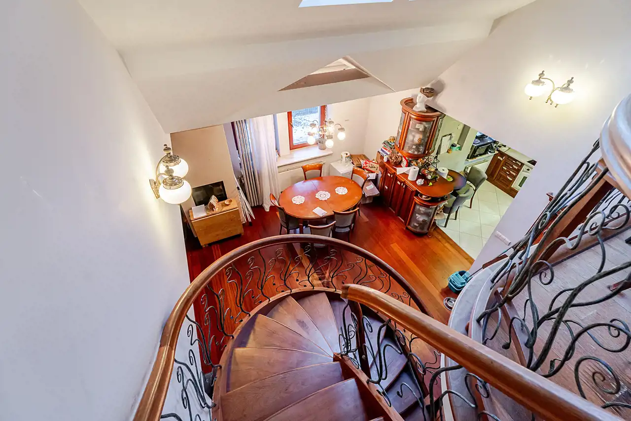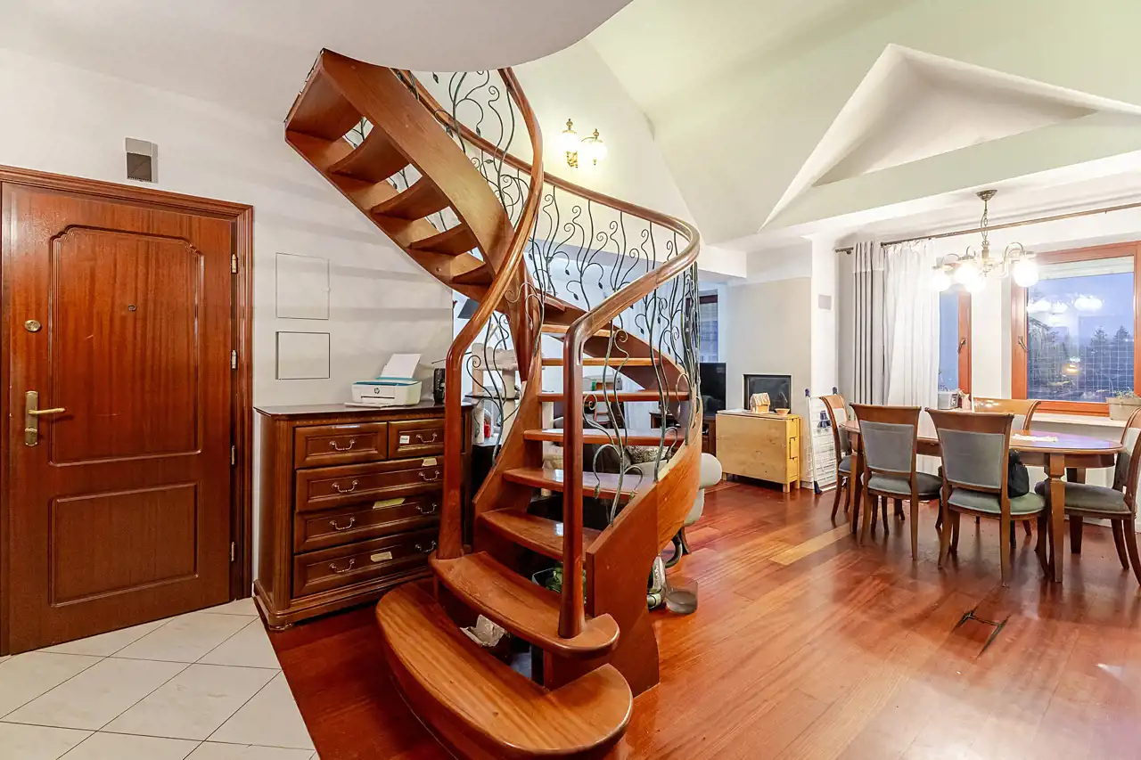 • duży hall ze schodami wykończonymi drewnem egzotycznym na drugi poziom