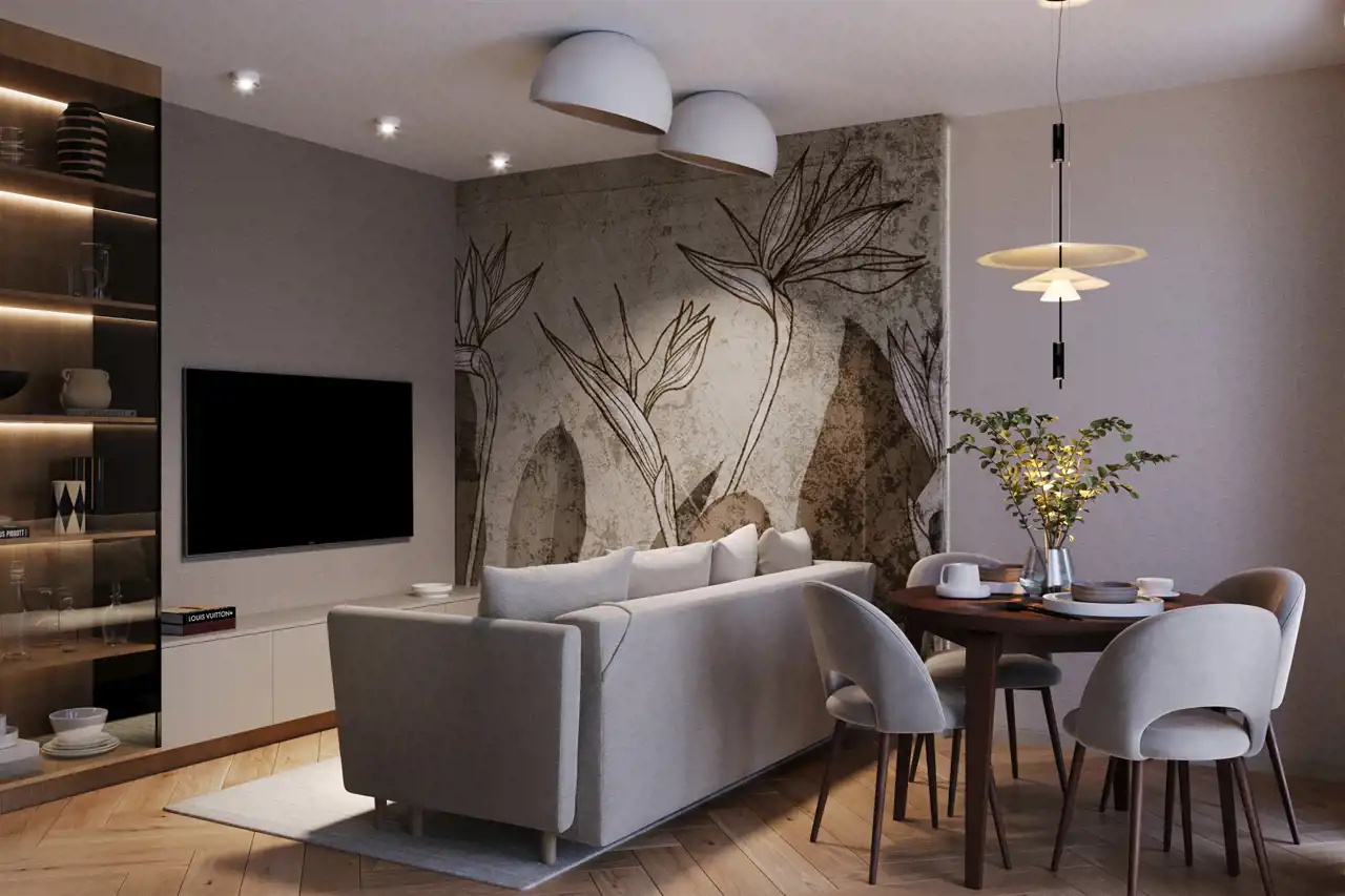 Mieszkanie składa się z trzech pokoi: dwóch ustawnych sypialni oraz dużego salonu z aneksem kuchennym, łazienki z wanną, garderoby oraz przedpokoju.