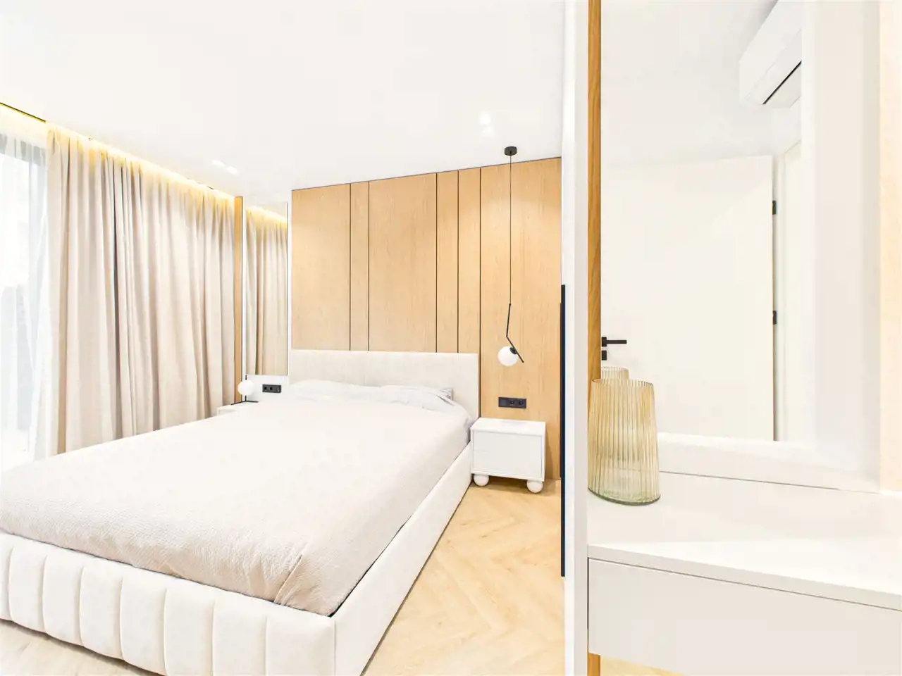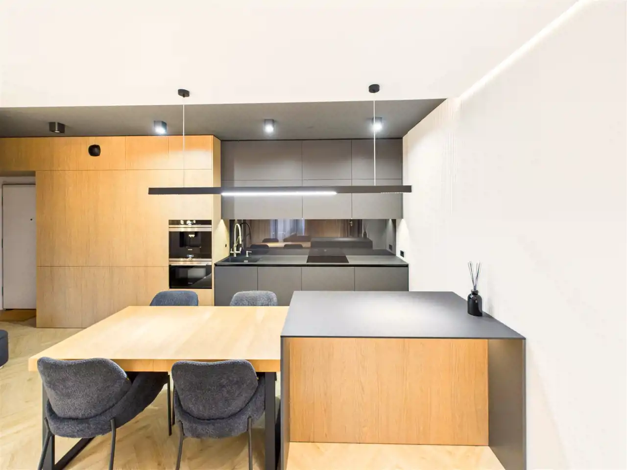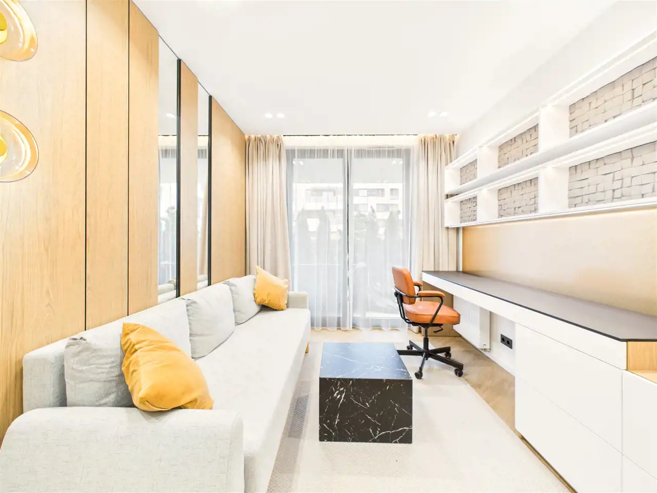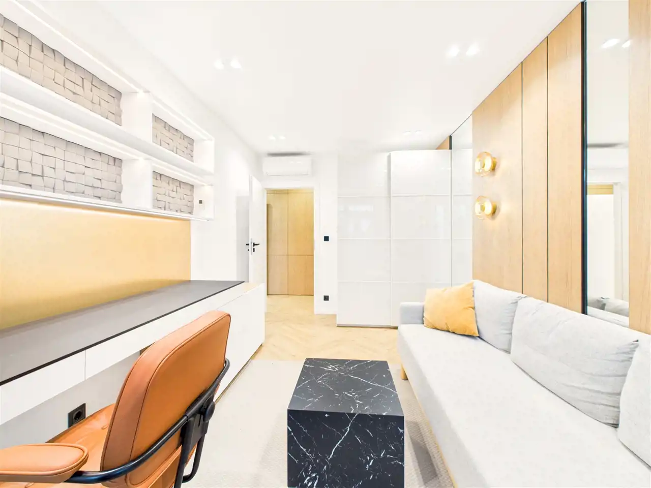 Mieszkanie zostało zaprojektowane przez architekta wnętrz i wykończone z użyciem materiałów premium. Na wyposażeniu m.in. system Smart Home, klimatyzacja we wszystkich pomieszczeniach oraz pełne umeblowanie – nieruchomość gotowa do zamieszkania.