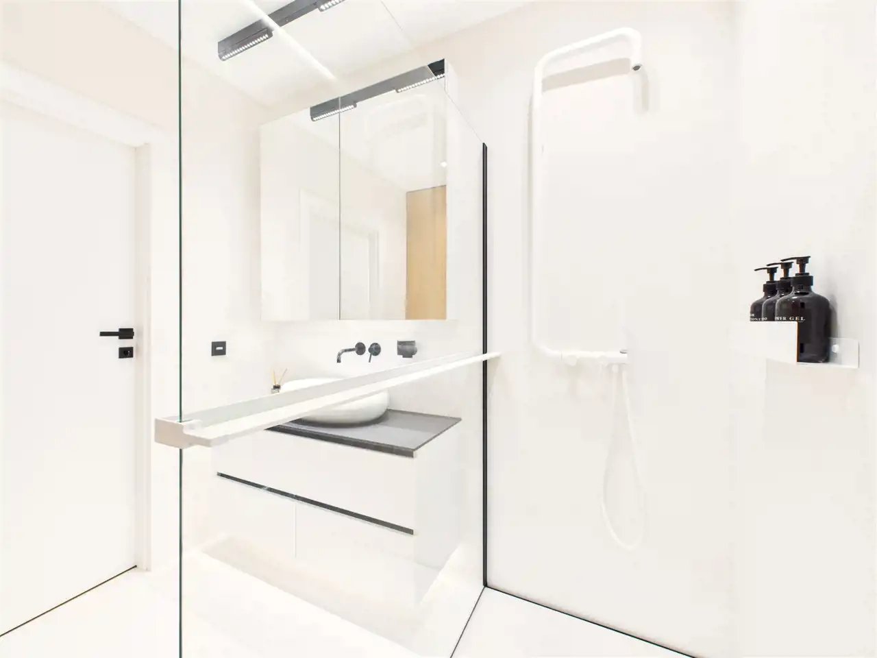 – modern bathroom with walk-in shower,