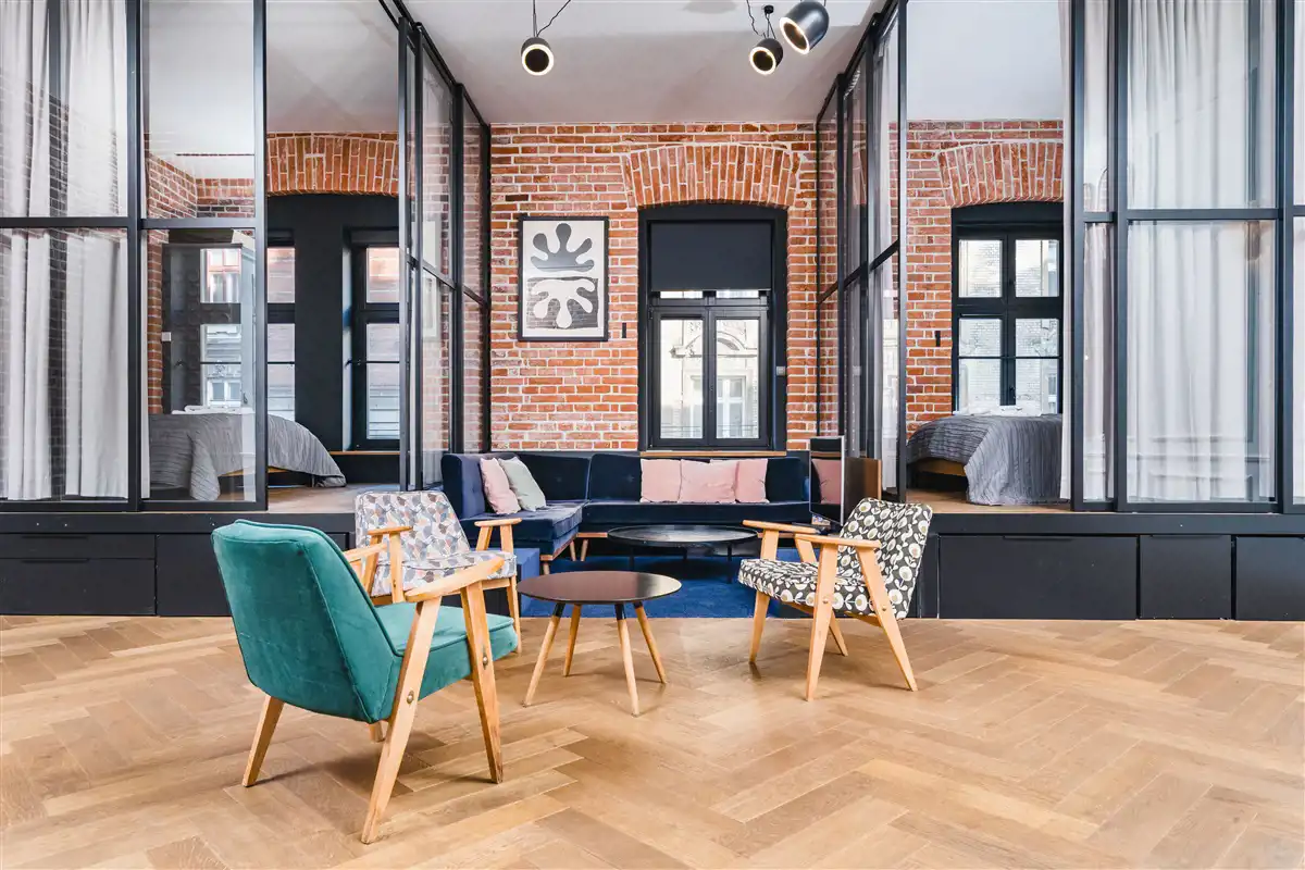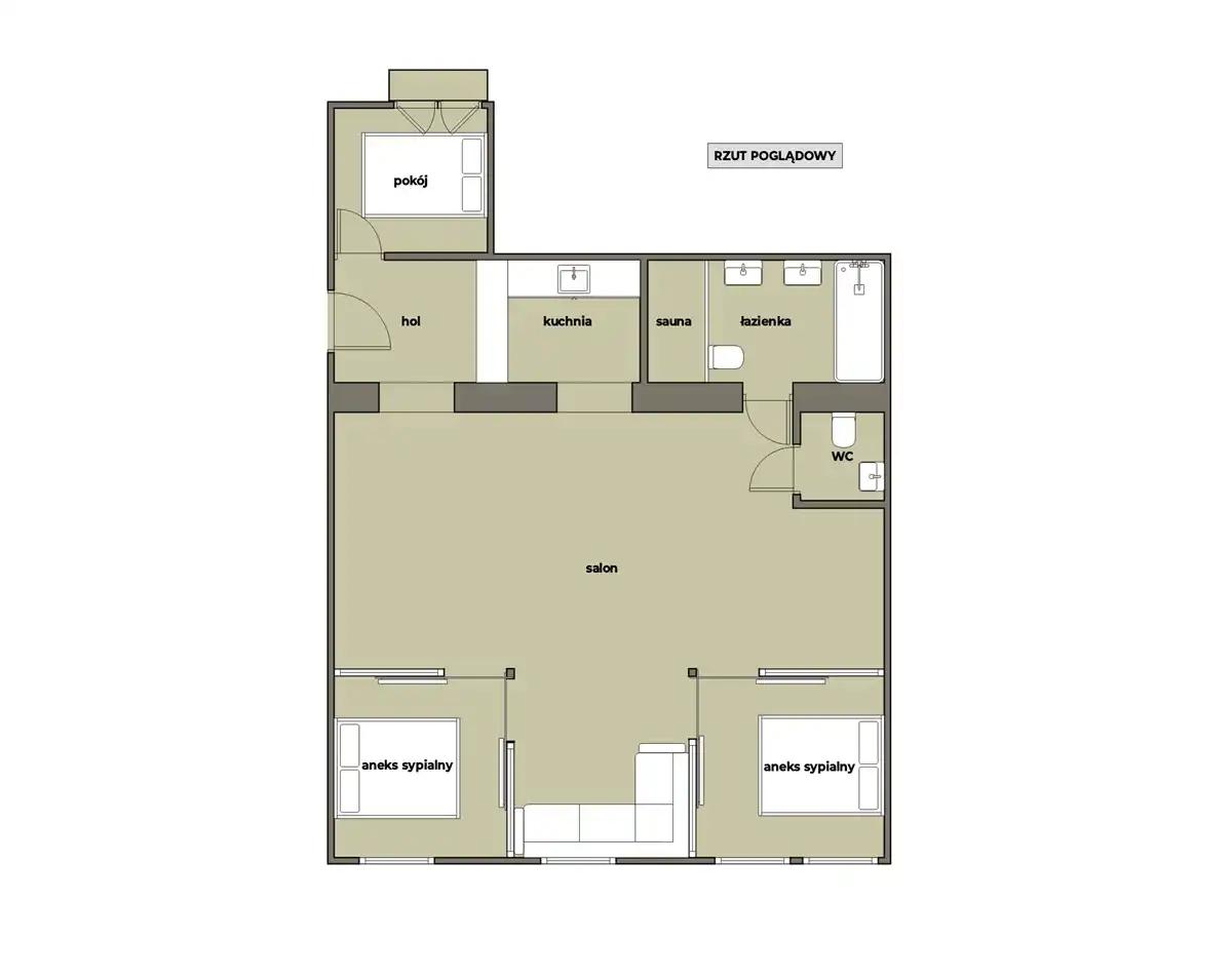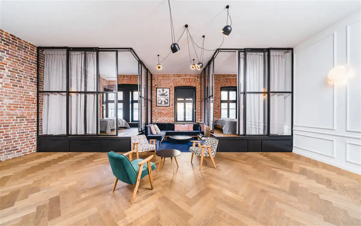 * open space z wydzielonymi strefami do spania ok. 58m2