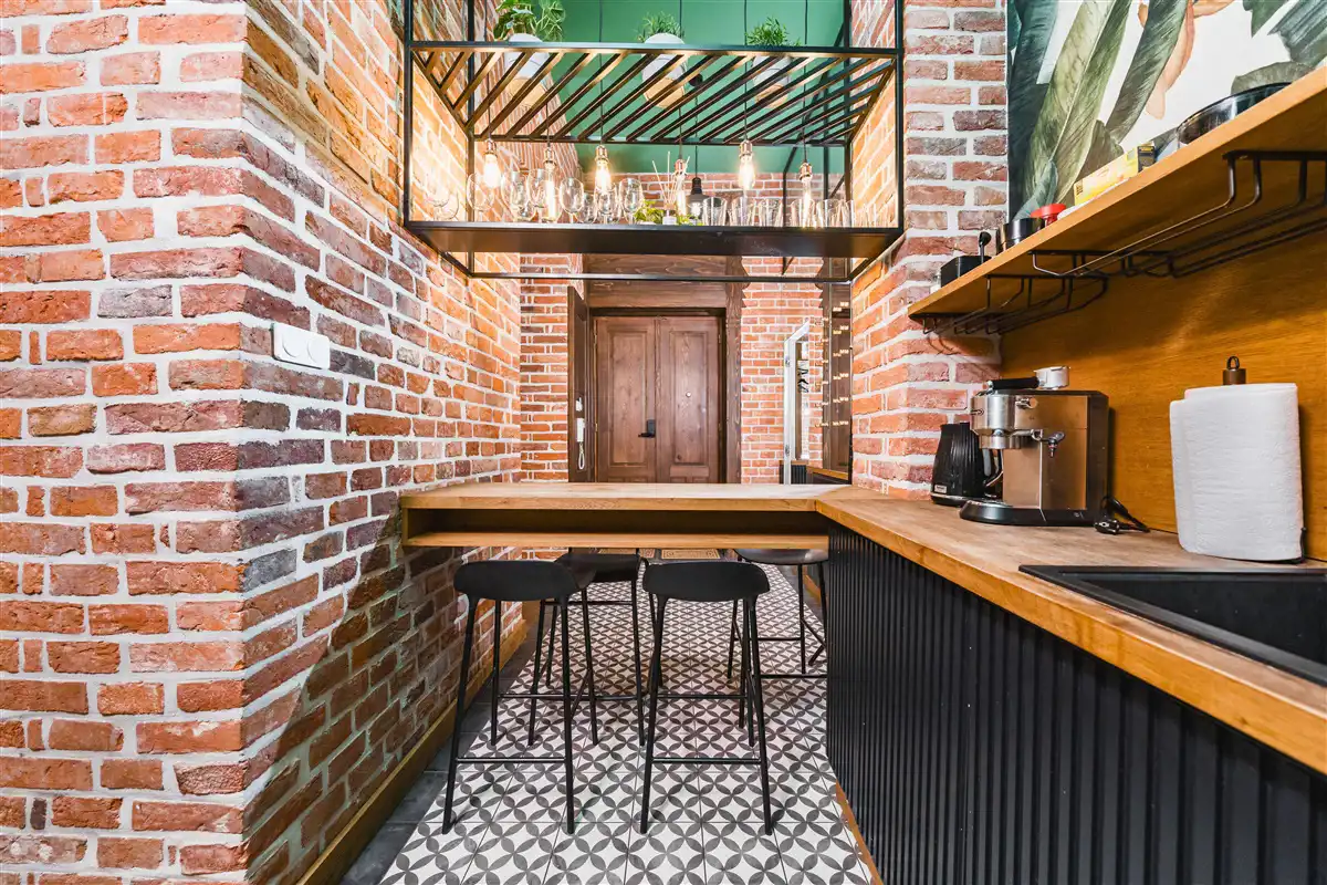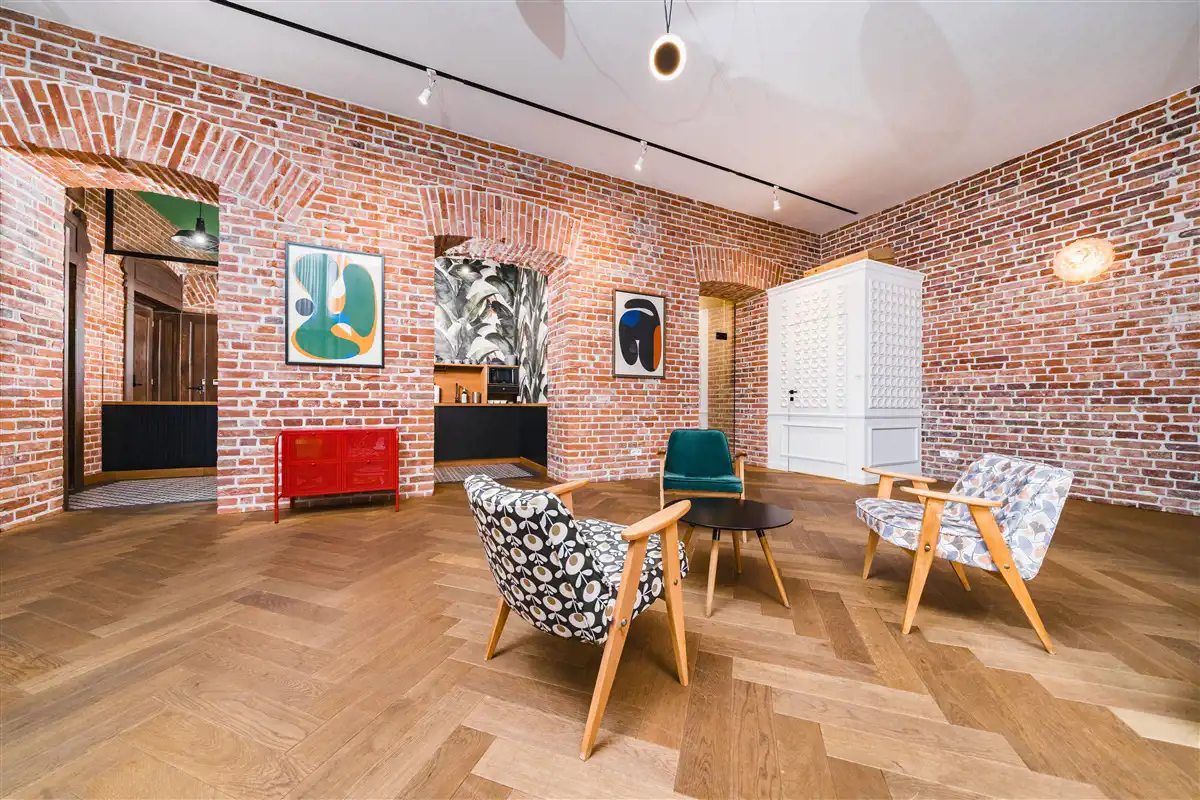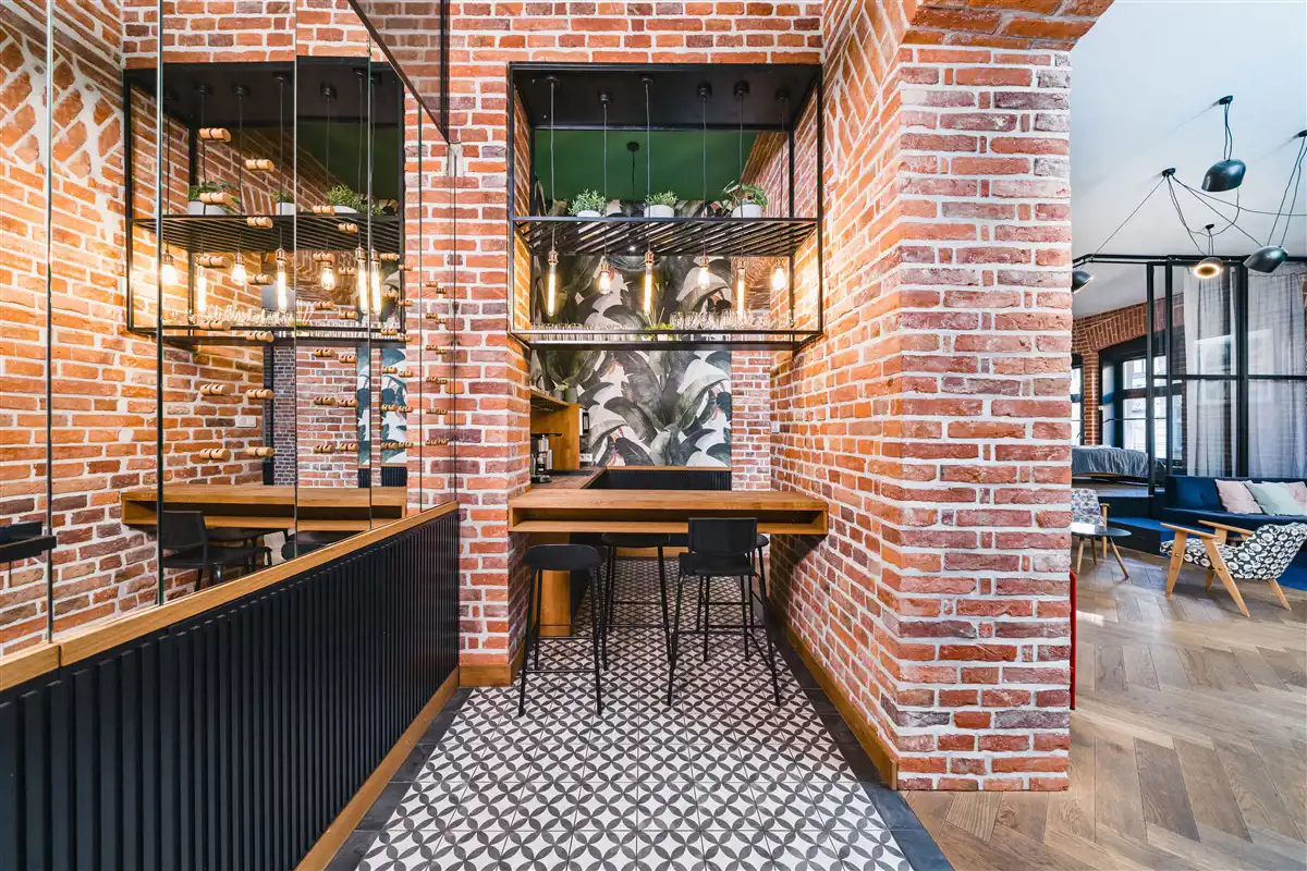 Remont obejmował wymianę elektryki, hydrauliki, odkrycie oryginalnej cegły, zamontowanie nowej stolarki, położenie podłóg, fliz itd.