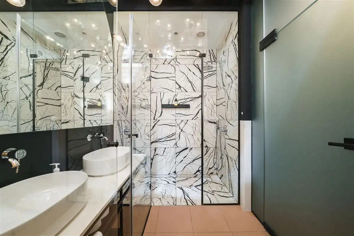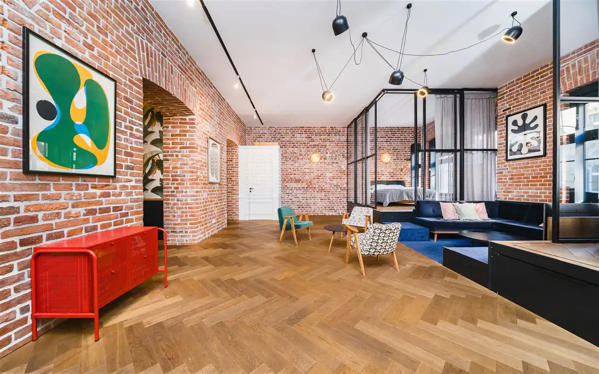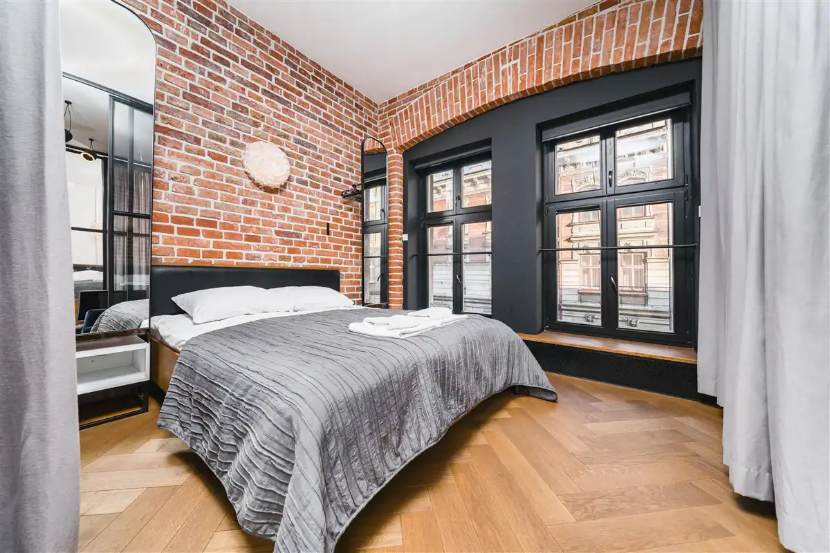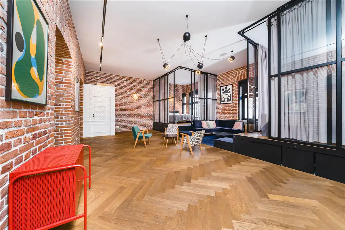 Remont obejmował wymianę elektryki, hydrauliki, odkrycie oryginalnej cegły, zamontowanie nowej stolarki, położenie podłóg, fliz itd.