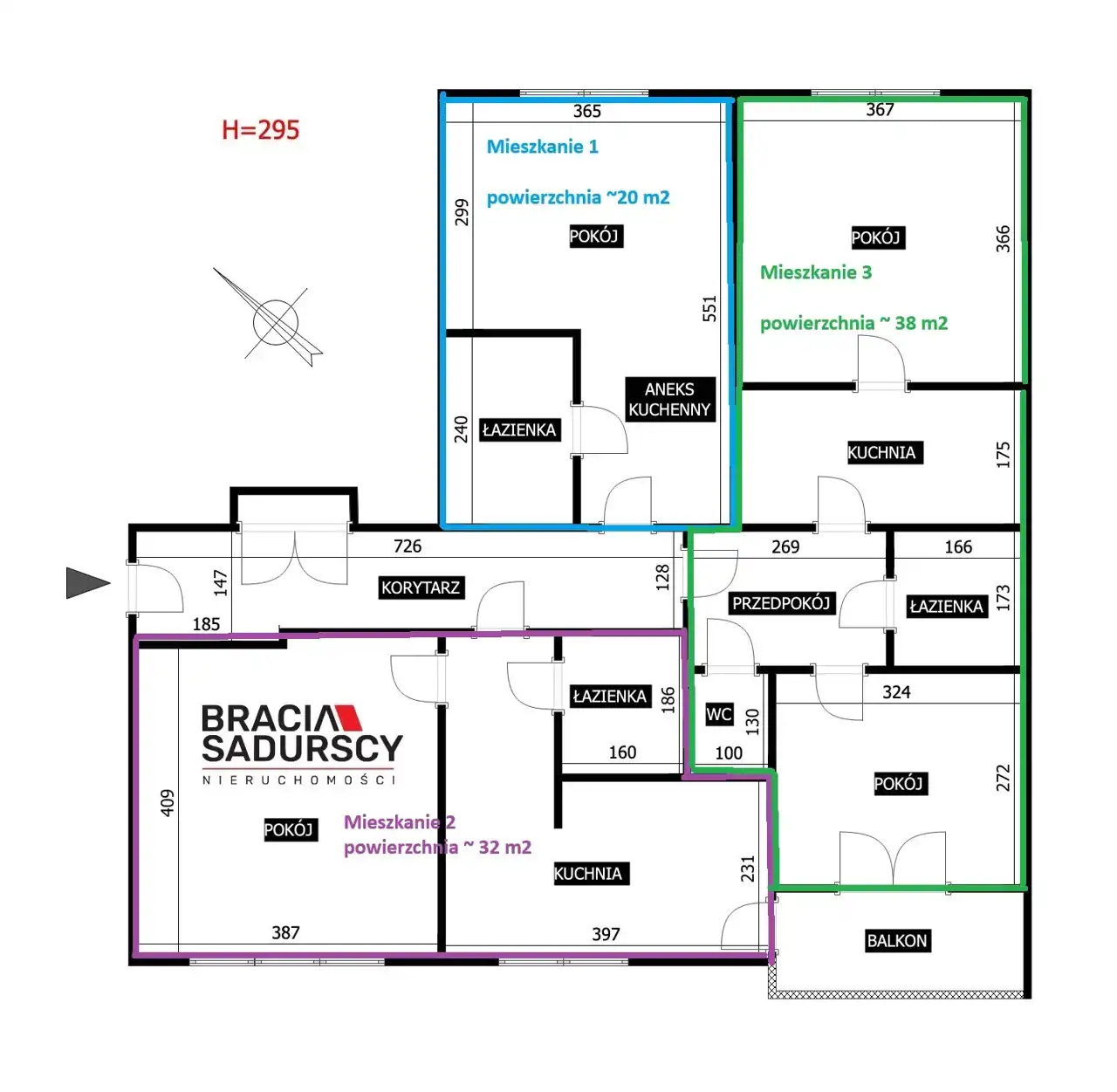 Mieszkanie o łącznej powierzchni 98,81 m2 obecnie podzielone jest na 3 niezależne mieszkania pod wynajem: