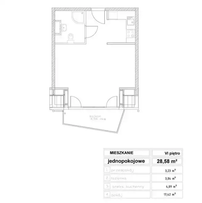 - Charakterystyka mieszkania 28.58 m2, 1 pokój