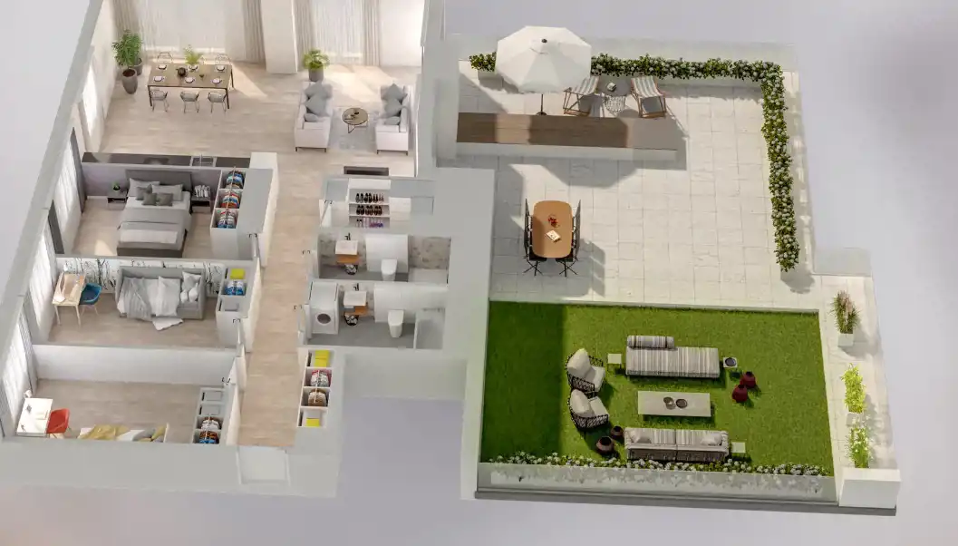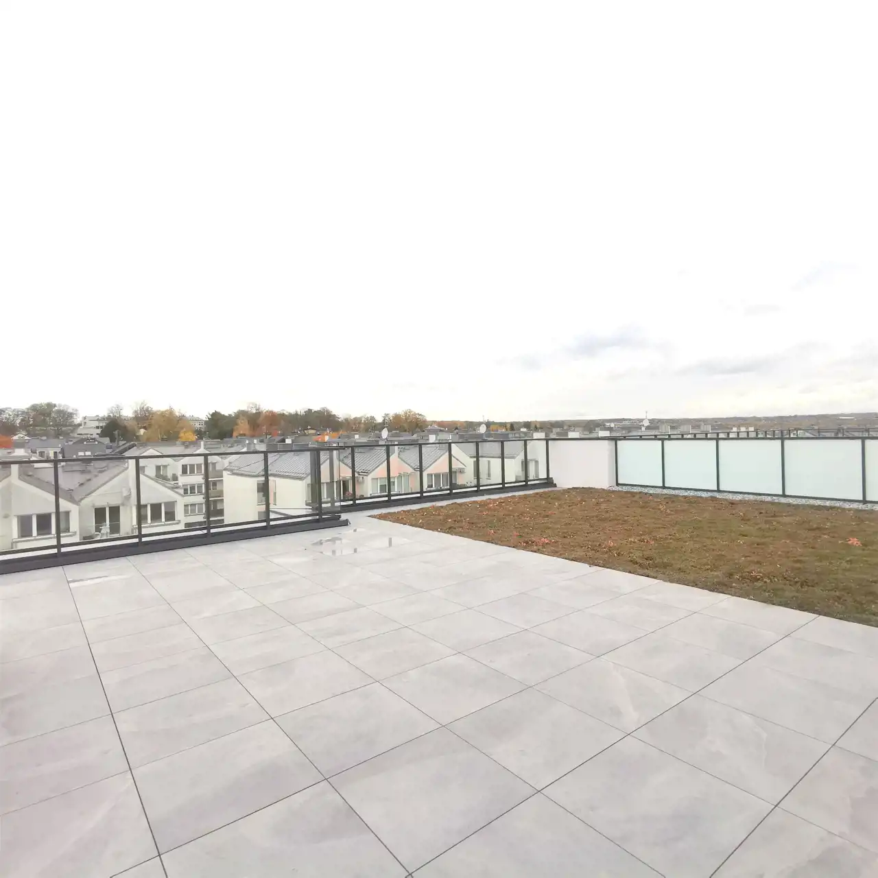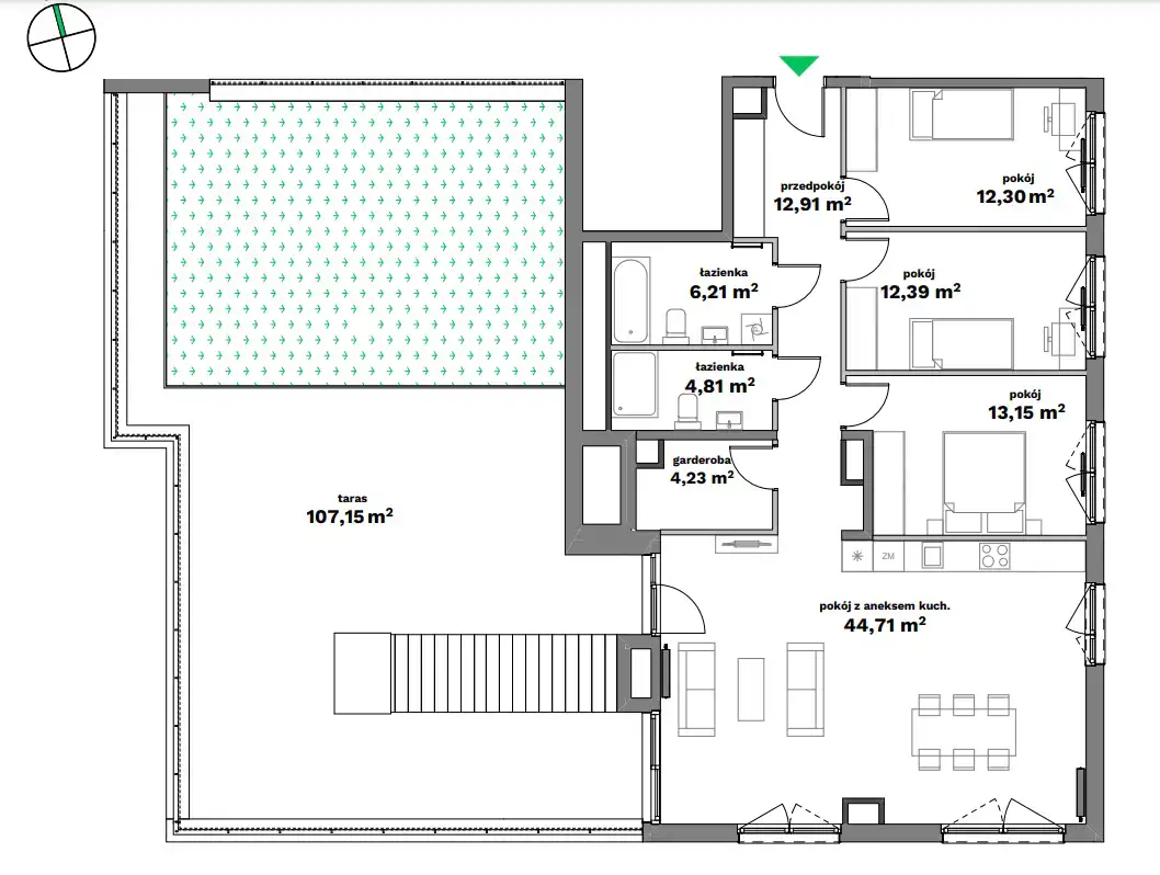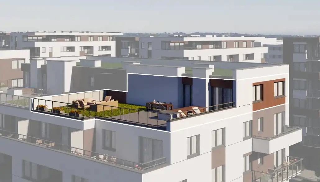 Mieszkanie składające się z przestronnego salonu z aneksem kuchennym, trzech sypialni, przedpokoju , łazienki, WC, garderoby oraz widokowego tarasu o pow. 107m2