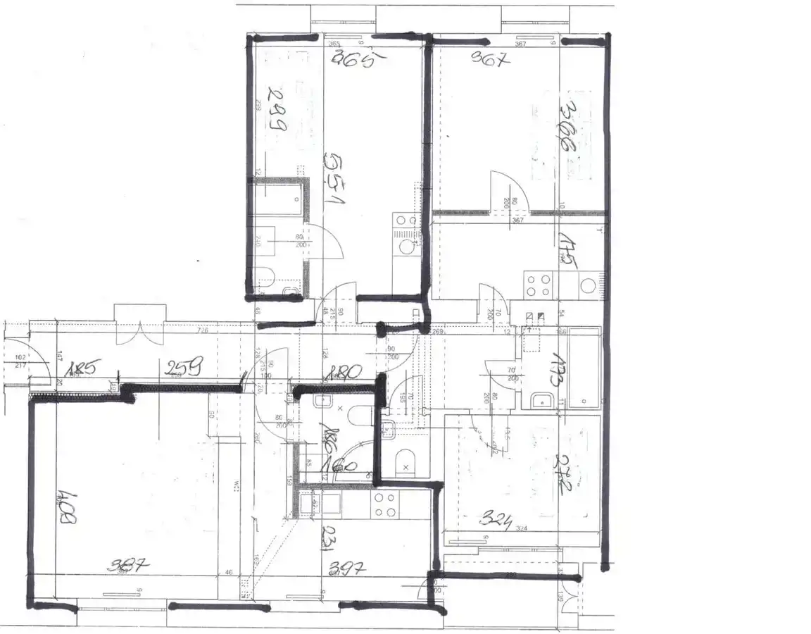 Nieruchomość została podzielona na trzy mieszkania: kawalerkę z aneksem kuchennym ok 20m2, kawalerkę z oddzielną kuchnią ok 37m2, oraz 2-pokojwe mieszkanie z oddzielną kuchnią ok 40m2.