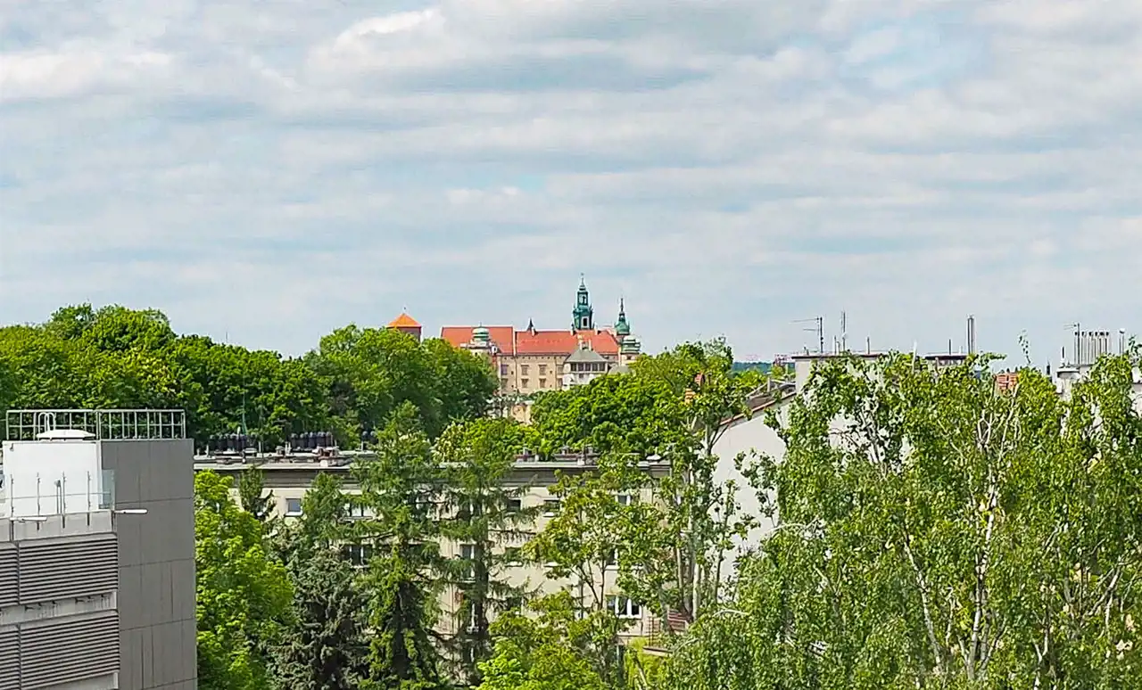 - sypialnia z widokiem na zielony skwer oraz Wawel