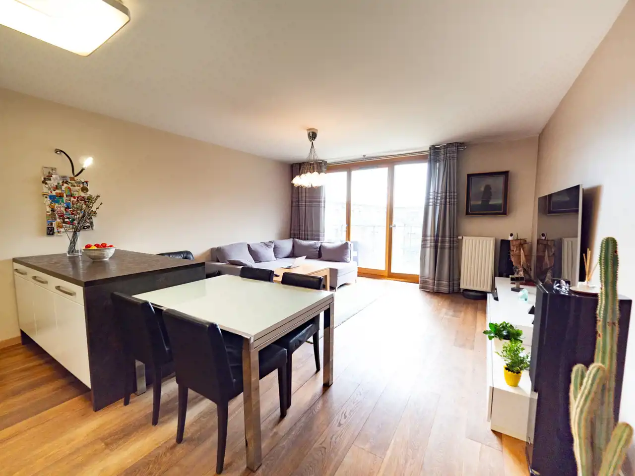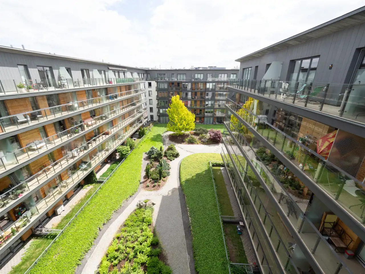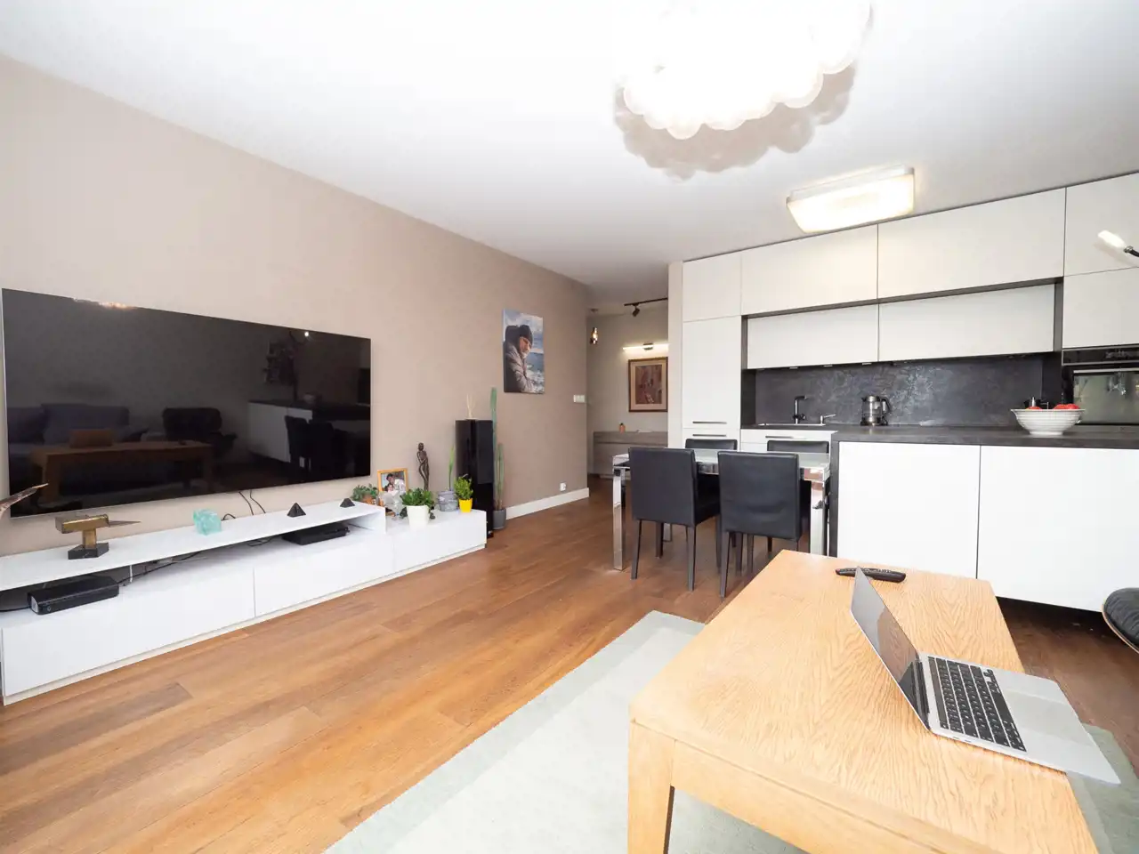 - pokój dzienny z aneksem kuchennym z wyjściem na balkon wychodzący na zielony dziedziniec