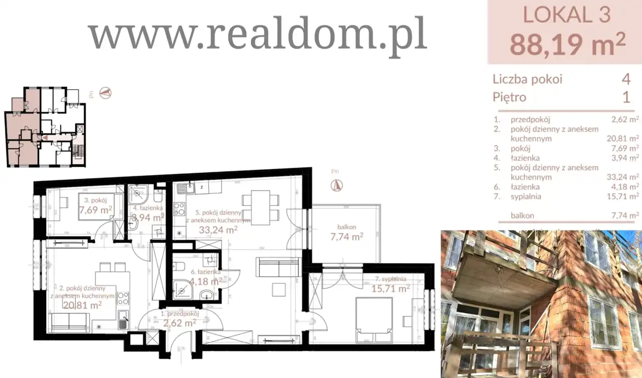 Mieszkanie nr 3 pow 88,19 m2 ,piętro 1 - 4 pokoje, 2x kuchnia w aneksie, 2x łazienka. Duże okna. balkon ok 8 m2 - to mieszkanie może być 2-packiem ( 2 x 2 pokoje)