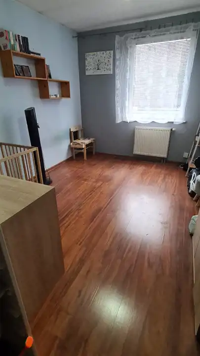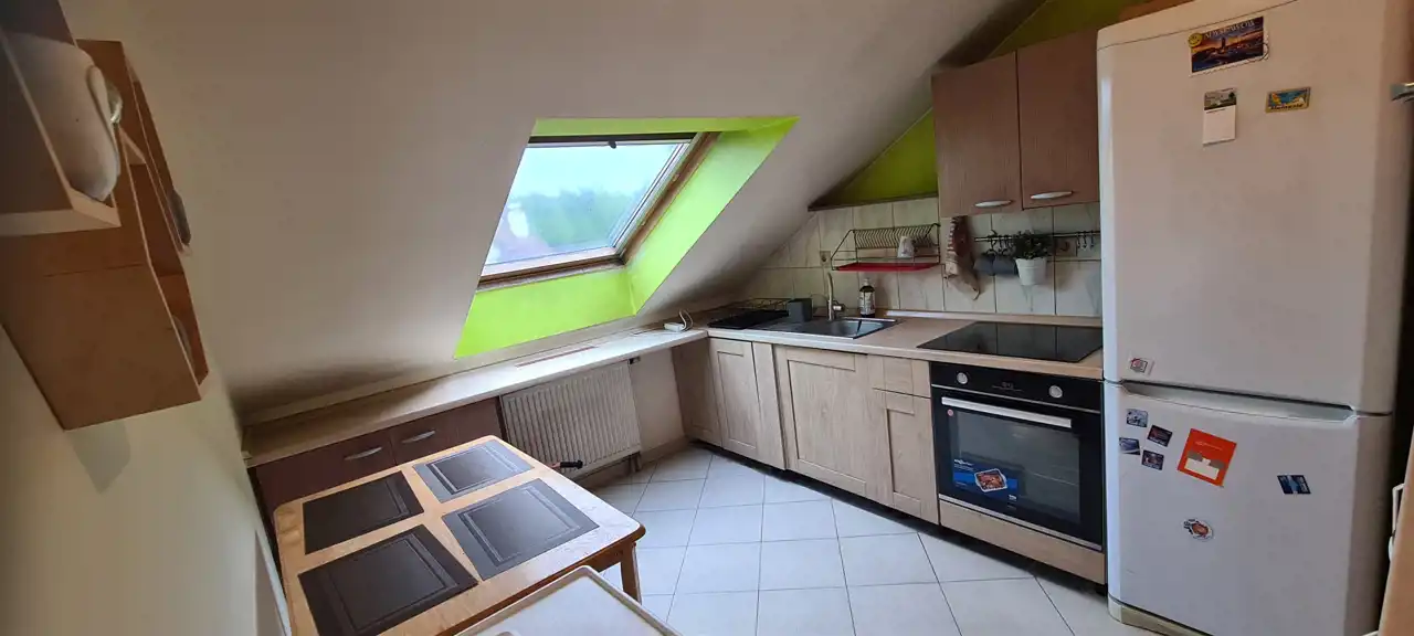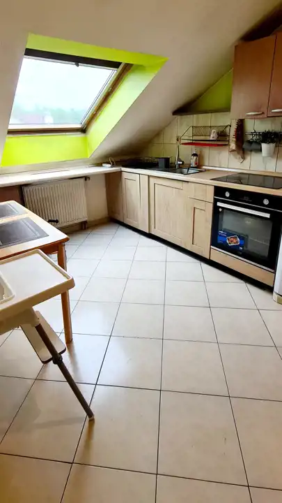 - oddzielnej jasnej kuchni (ze skosem) wyposażonej w meble kuchenne wraz z urządzeniami AGD tj. kuchenką, piekarnikiem, lodówką. Podłoga - panele,