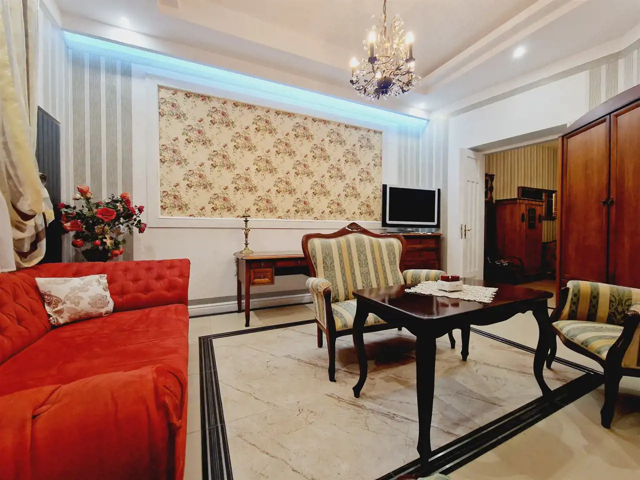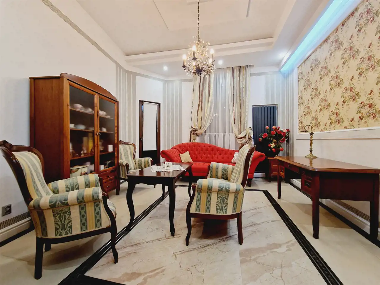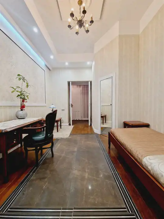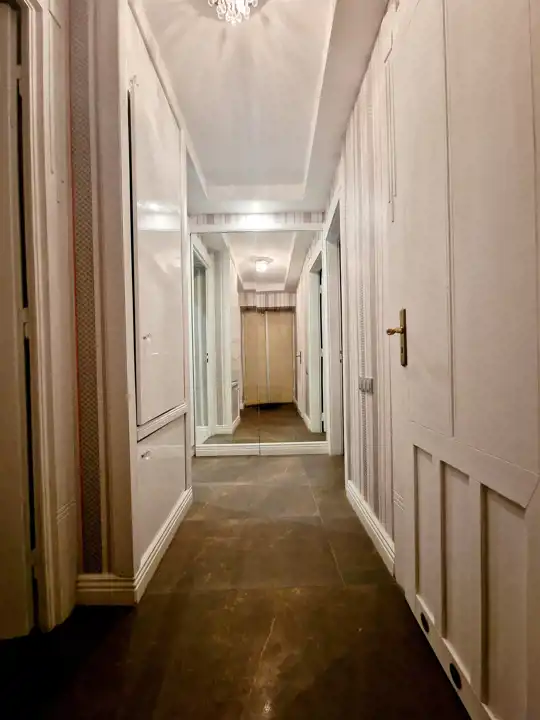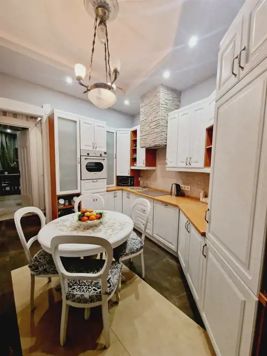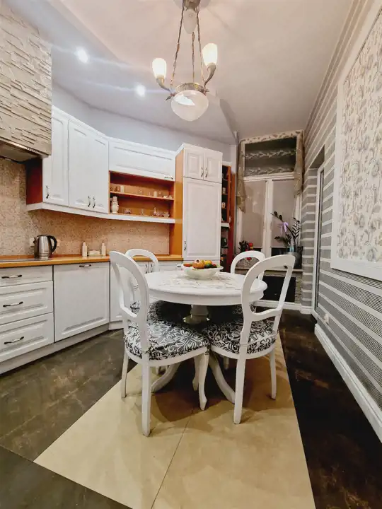 Nieruchomość oddawana jest w stanie do wprowadzenia. Na ścianach tynki odmalowane na jasne kolory a także tapety w pasiaste wzory, ornamentami z dodatkami kwiatowymi. Podłogi mieszkania w gresie wielkoformatowym - zdobionym z elementami trawertynu w centralnych częściach podłogi w pokojach. Sufity częściowo obniżane z oświetleniem punktowym, w centralnych miejscach sufitu zawisły natomiast zdobione żyrandole. Kuchnia z meblami na zamówienie z wszystkimi sprzętami na wyposażeniu. Łazienki wykończone w wysokim standardzie z wanną wolno stojącą oraz deszczownicą na wyposażeniu. Drzwi do mieszkania zachowane w stylu kamienicznym zostały obite i ocieplone od strony apartamentu.