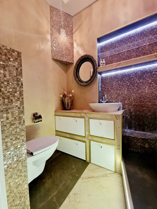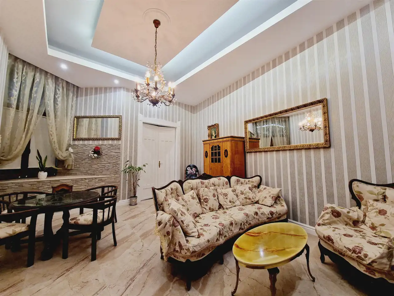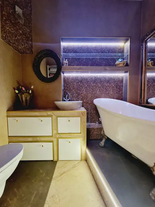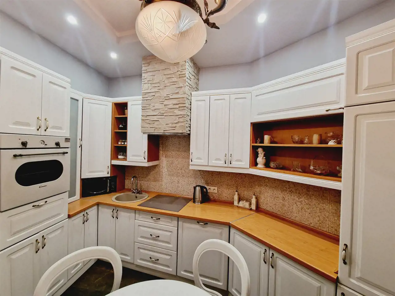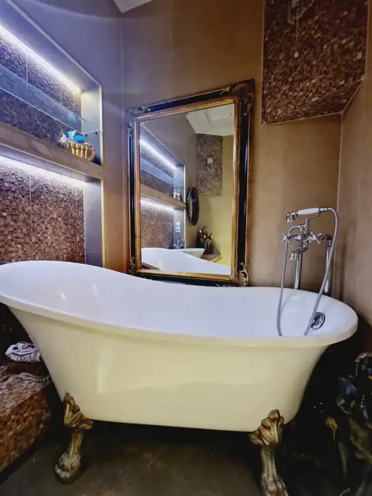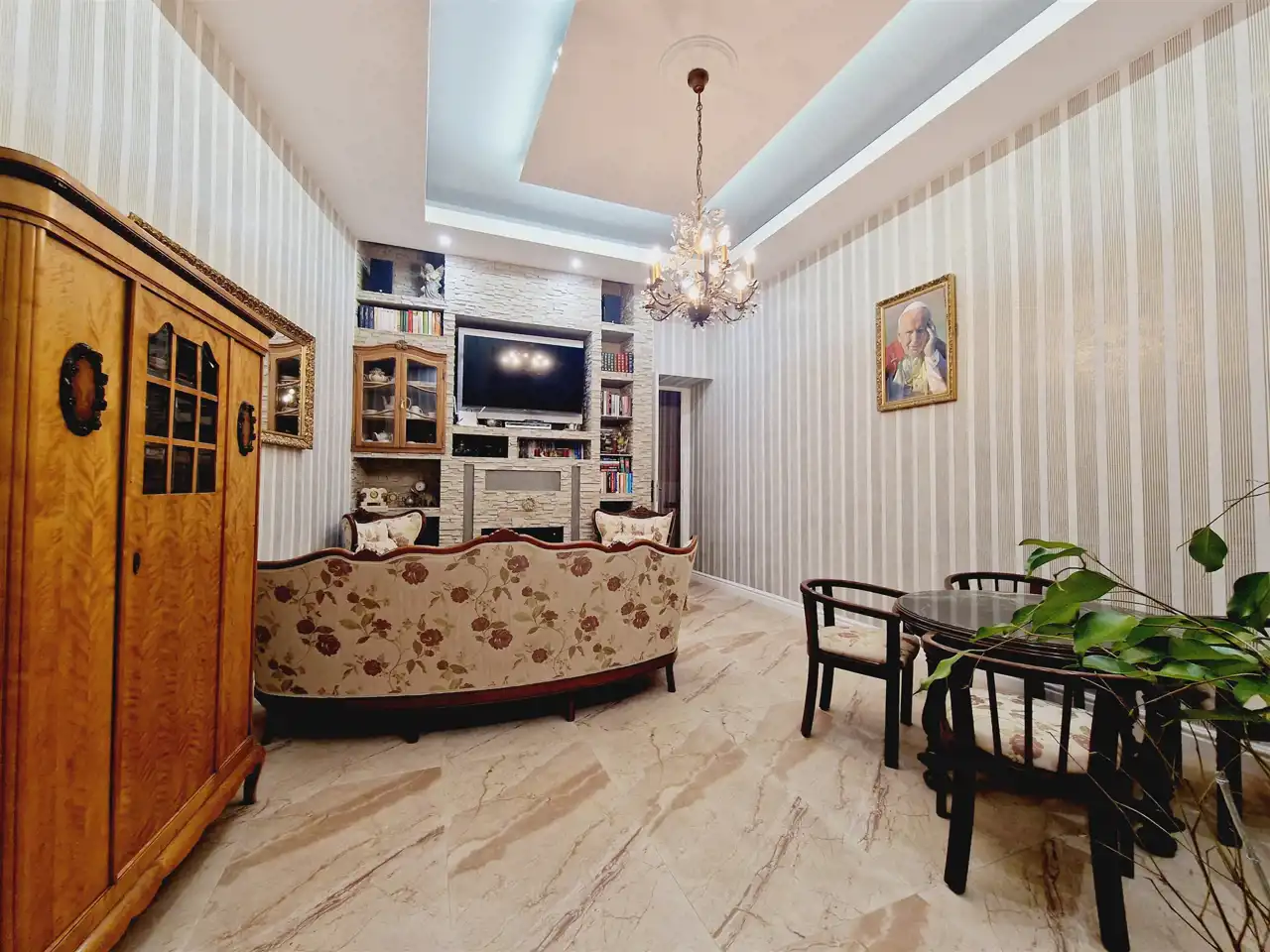 Nieruchomość oddawana jest w stanie do wprowadzenia. Na ścianach tynki odmalowane na jasne kolory a także tapety w pasiaste wzory, ornamentami z dodatkami kwiatowymi. Podłogi mieszkania w gresie wielkoformatowym - zdobionym z elementami trawertynu w centralnych częściach podłogi w pokojach. Sufity częściowo obniżane z oświetleniem punktowym, w centralnych miejscach sufitu zawisły natomiast zdobione żyrandole. Kuchnia z meblami na zamówienie z wszystkimi sprzętami na wyposażeniu. Łazienki wykończone w wysokim standardzie z wanną wolno stojącą oraz deszczownicą na wyposażeniu. Drzwi do mieszkania zachowane w stylu kamienicznym zostały obite i ocieplone od strony apartamentu.