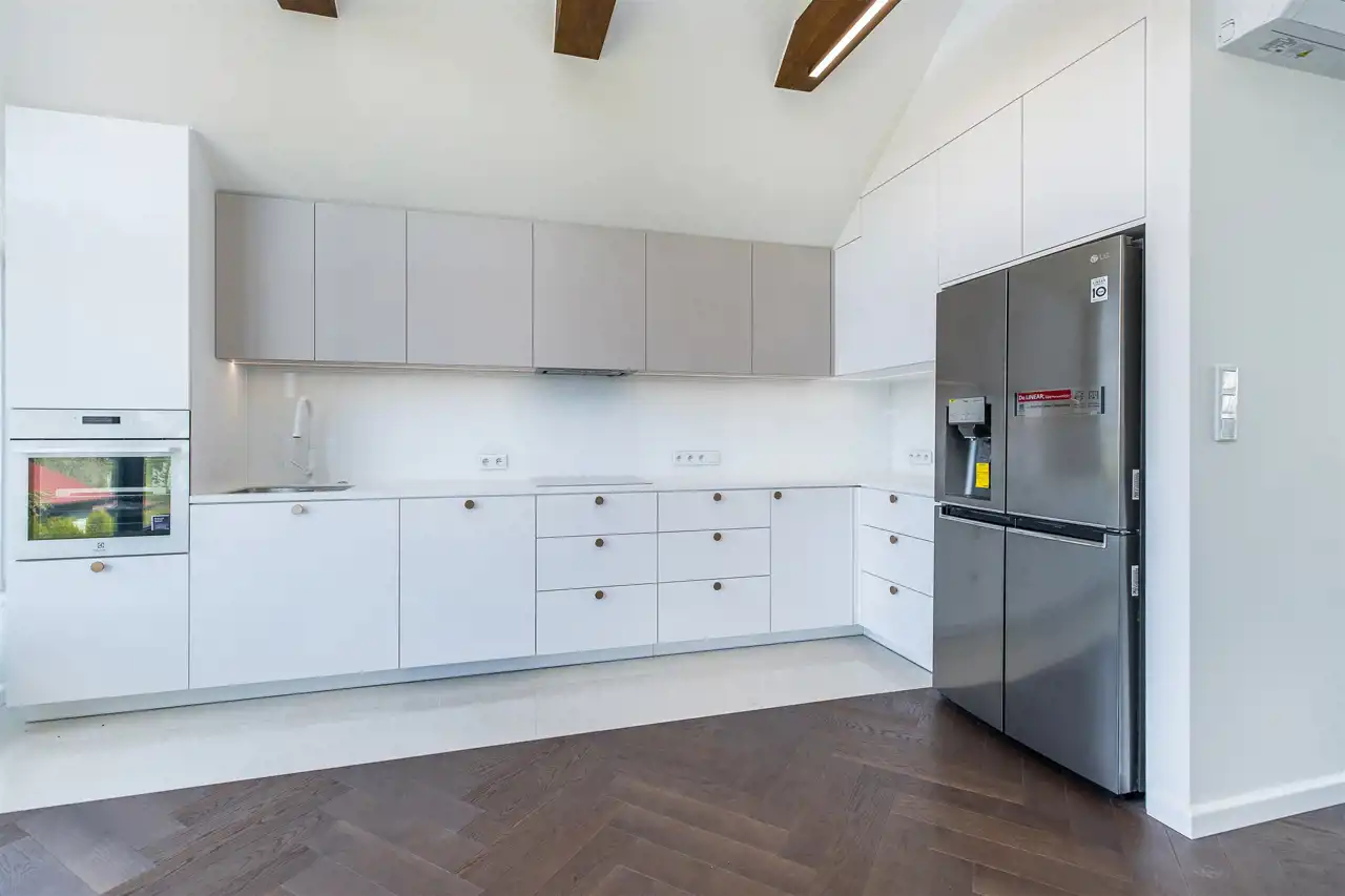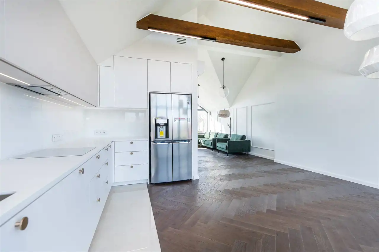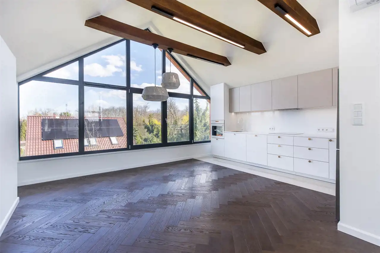 - idealnie doświetlonego salonu połączonego z nowocześnie zaaranżowanym aneksem kuchennym. Ogromne przeszklenia z obu stron zapewniają dużo światła dziennego.