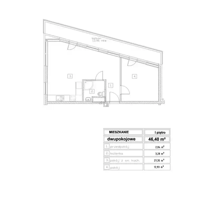 - Charakterystyka mieszkania 46.4 m2, 2 pokoje