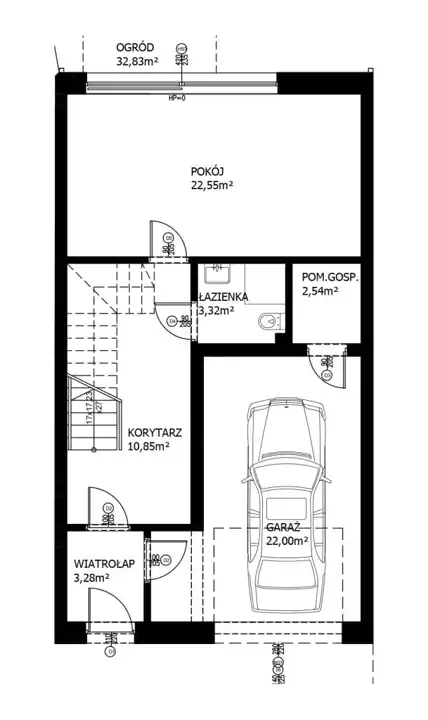- Na parterze znajduje się garaż (dodatkowo płatny 120 000 zł), duży pokój z wyjściem do prywatnego ogródka, łazienka oraz pomieszczenie gospodarcze.