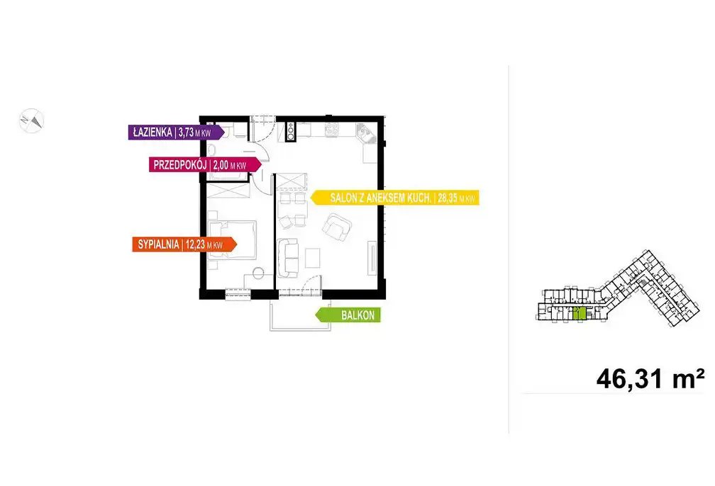 - Charakterystyka mieszkania 46.31 m2, 2 pokoje