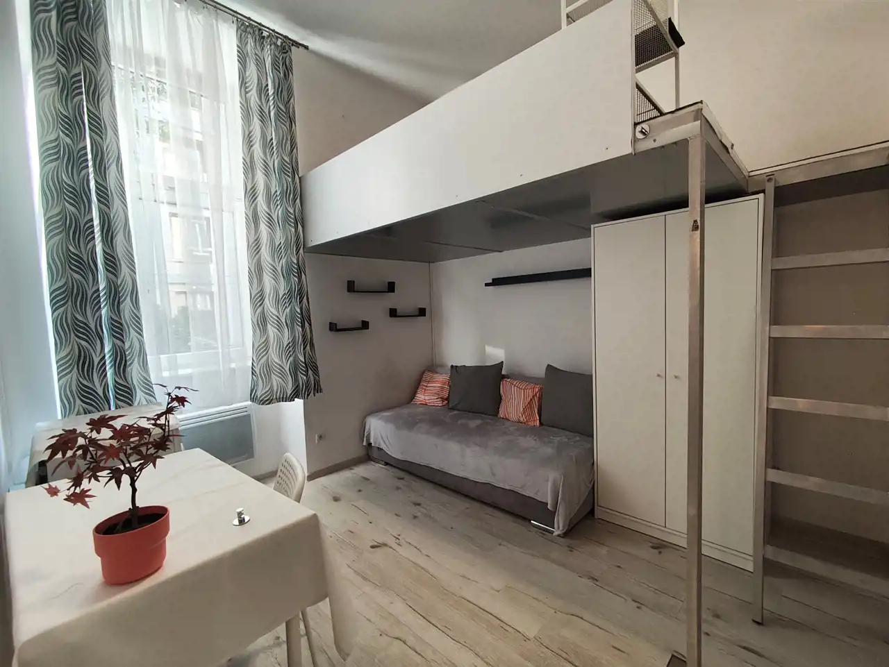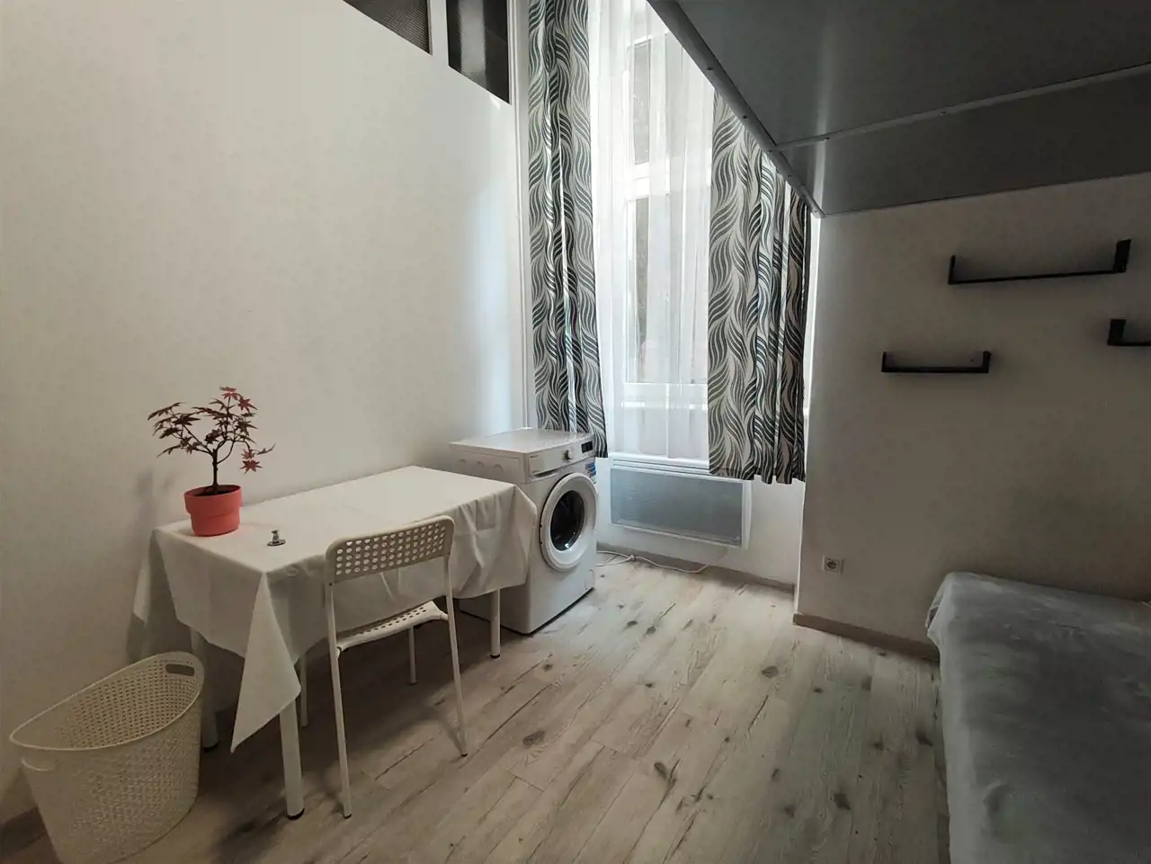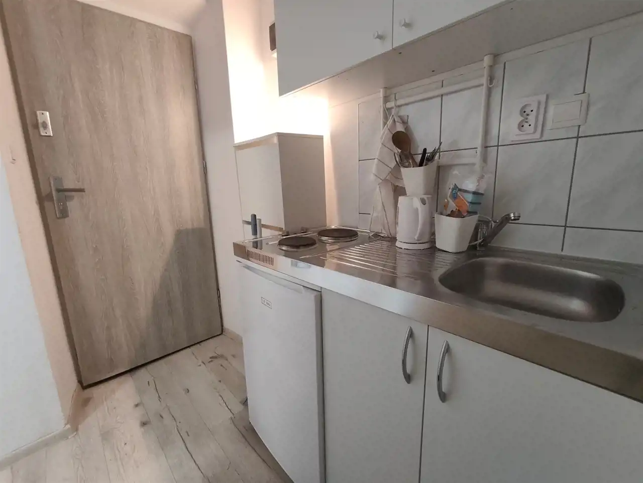 Mieszkanie ma powierzchnię 15m2, składa się z pokoju, przejściowej kuchni w przedpokoju, oraz łazienki połączonej z wc, w pokoju znajduje się mała antresola, gdzie mieści się się część sypialniana.