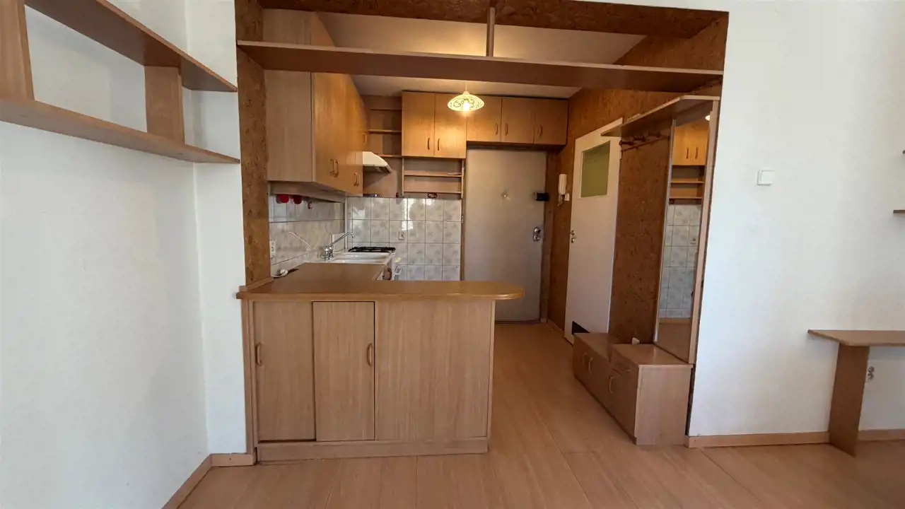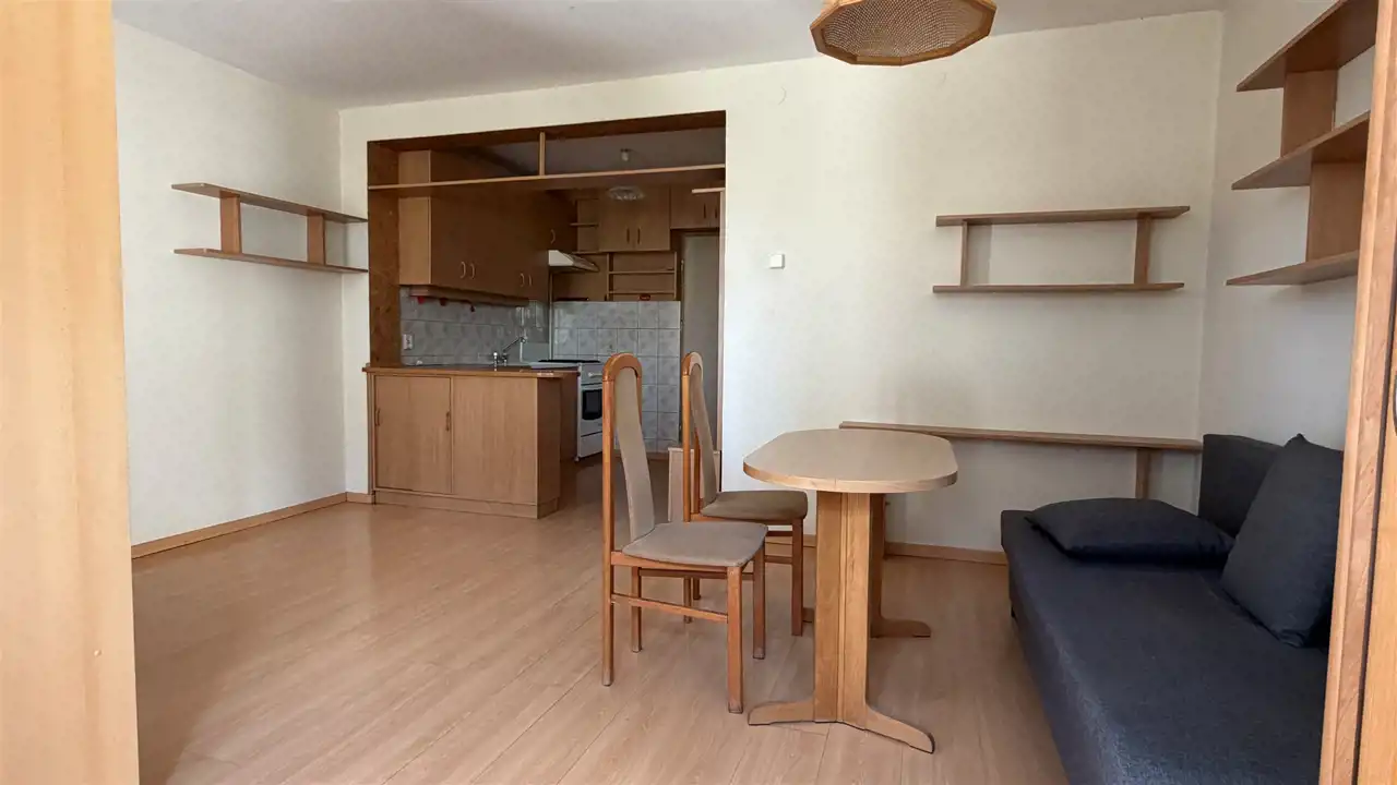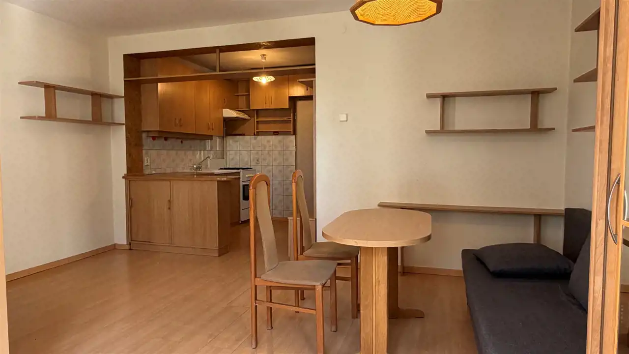 Funkcjonalny układ: duży pokój z aneksem kuchennym oraz spora łazienka.
