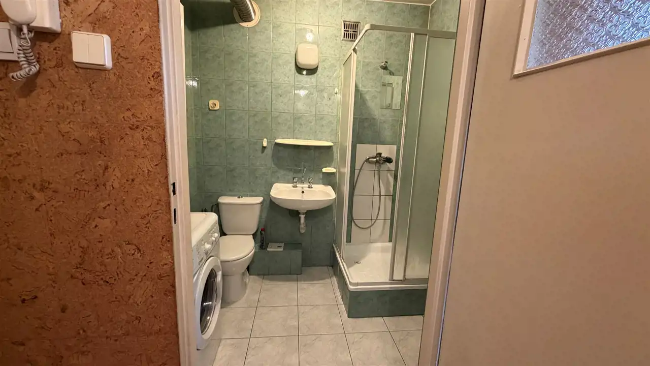 Łazienka z kabiną prysznicową i WC, wykończona płytkami z końca lat 90‑tych.