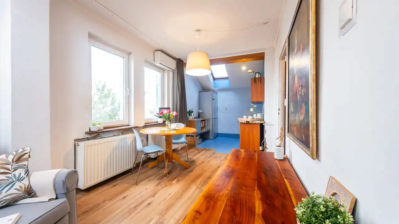 Z okien salonu rozpościera się piękny widok na dachy pobliskich budynków i drzewa, a wnikliwe oko przy dobrej pogodzie dostrzeże nawet Kopiec Kościuszki. Ustawny salon połączony z jadalnią i kuchnią stanie się sercem domu, w którym chętnie odpoczniemy w gronie rodziny czy przyjaciół.